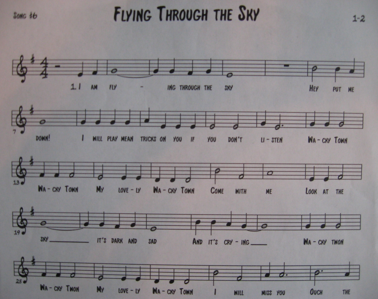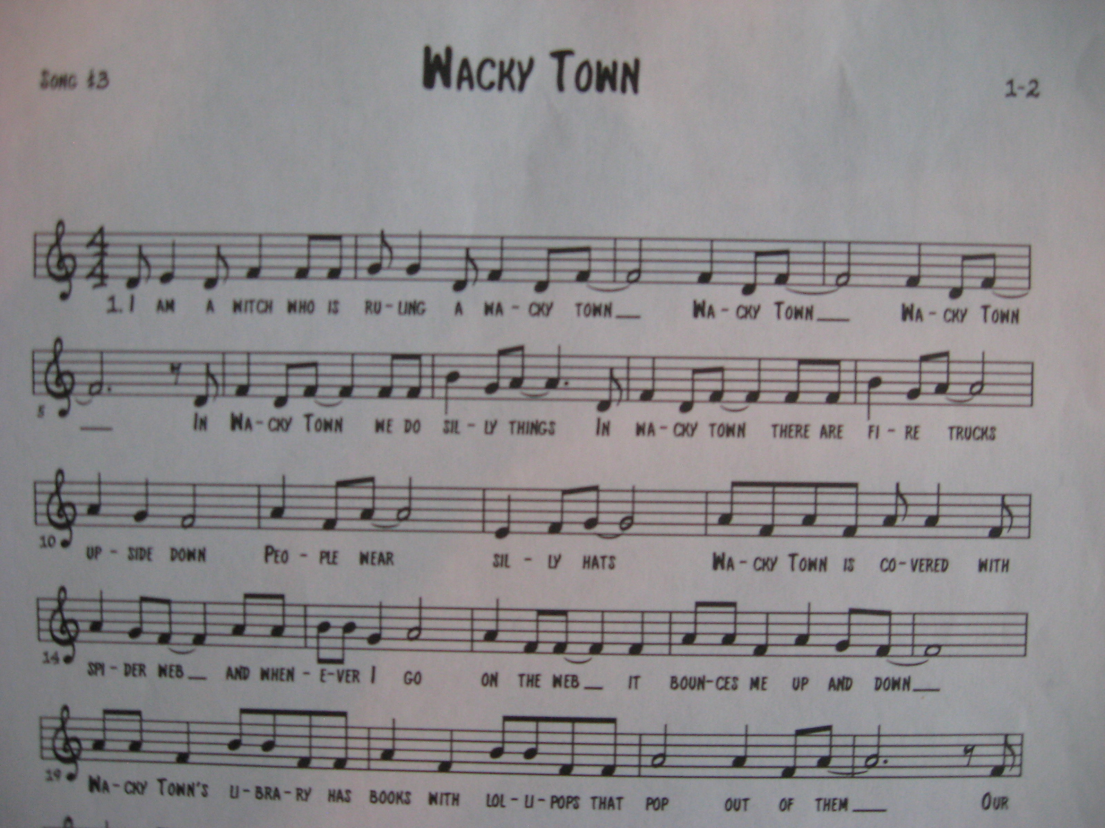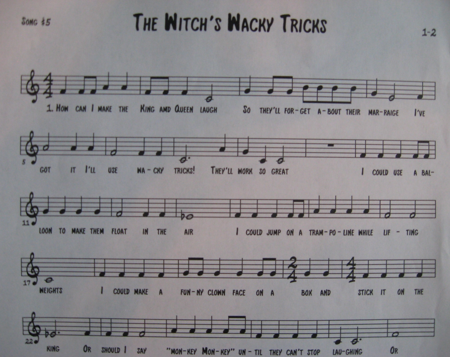 The Witch plans to do such wacky tricks that the King and Queen will laugh so much they will forget their love forever. Then the Witch will be able to get the King to be mayor of Wacky Town. The Witch, in disguise, gets past the guards and starts her wacky song: