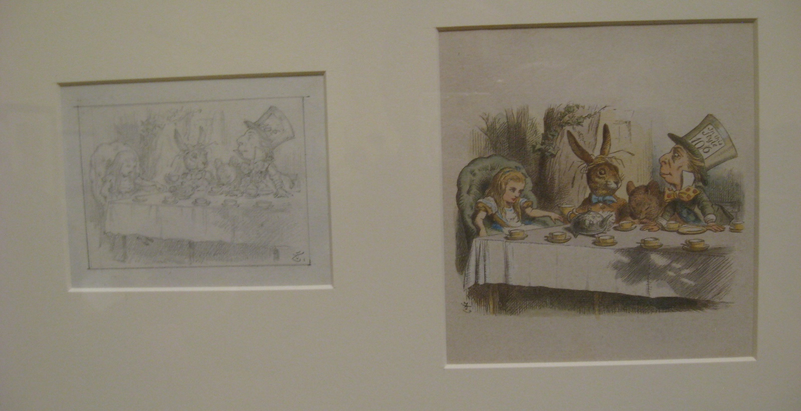 Alice exhibit 2The exhibit focuses heavily on John Tenniel’s original illustrations, which in the guide’s (and my humble) opinion are the standard against which all future illustrations are (usually unfavorably) measured.  John Tenniel, who lived to be 94(!), drew only in pencil, so any ink or colored in version of his work would be a copy, not necessarily a forgery but often mistakenly attributed to Tenniel.  For “Alice’s Adventures in Wonderland” Carroll meticulously pre-planned subject and lay-out of all illustrations, and drew many himself.  He was unsatisfied with the quality of his own work, and thus turned to Tenniel.  When Carroll hired Tenniel to illustrate the second Alice book “Through the Looking Glass”, Carroll had so much confidence in Tenniel’s work that he gave the artist free reign to choose and design the illustrations.  Carroll even excised a chapter called “The Wasp in the Wig”, when Tenniel insisted it was not possible to illustrate such a thing.