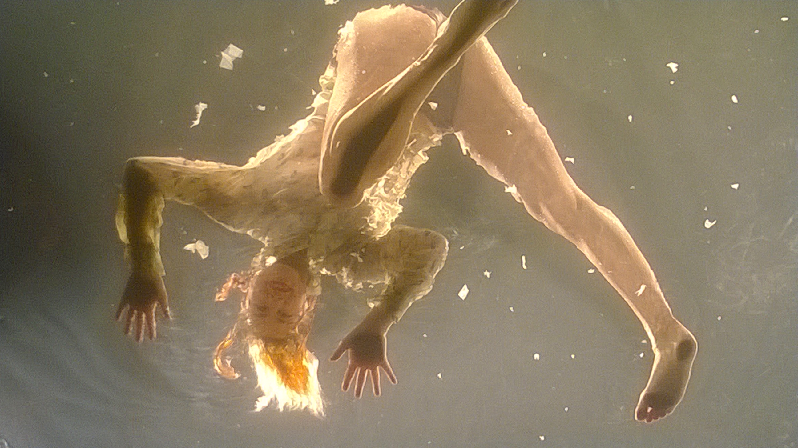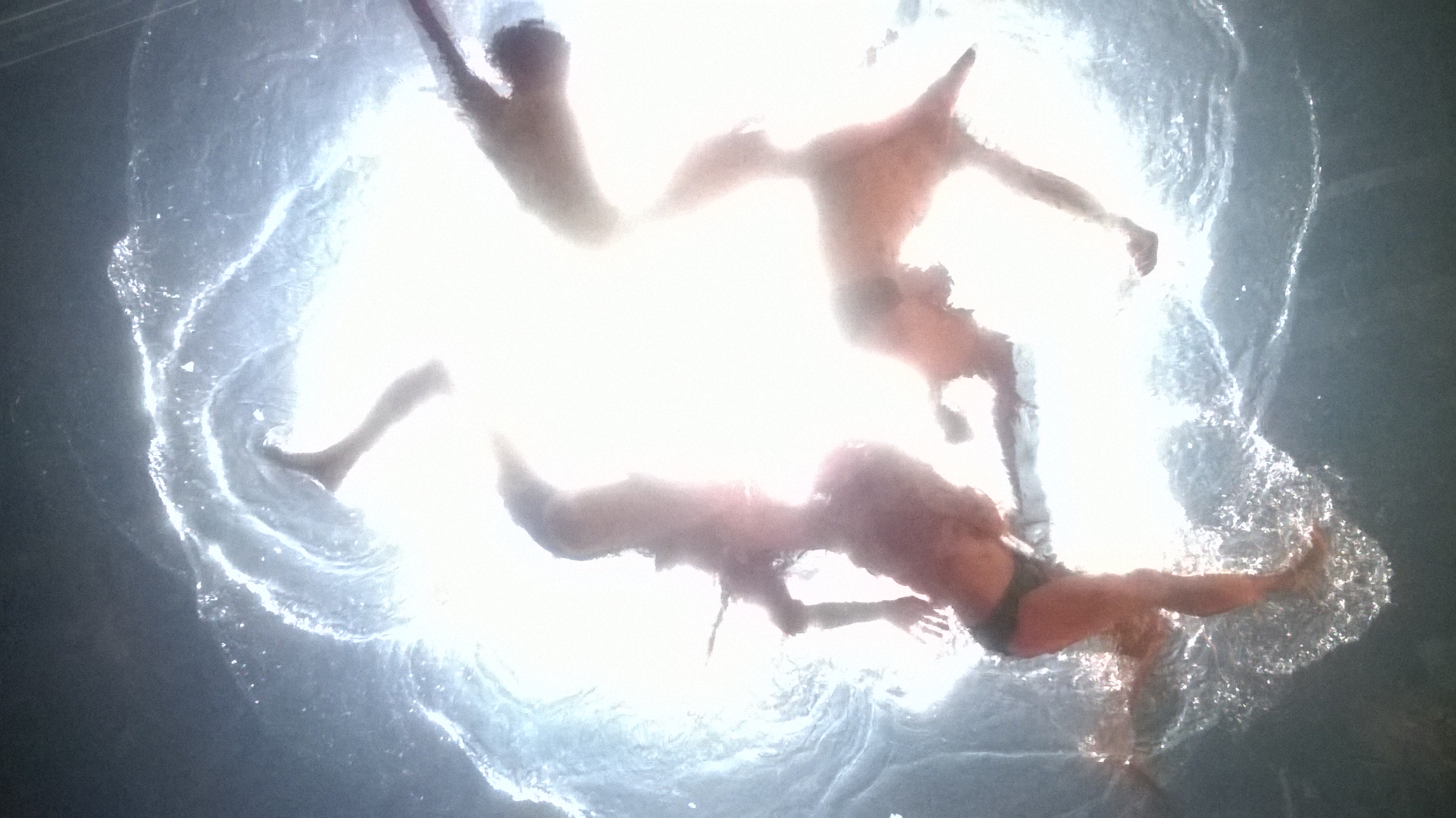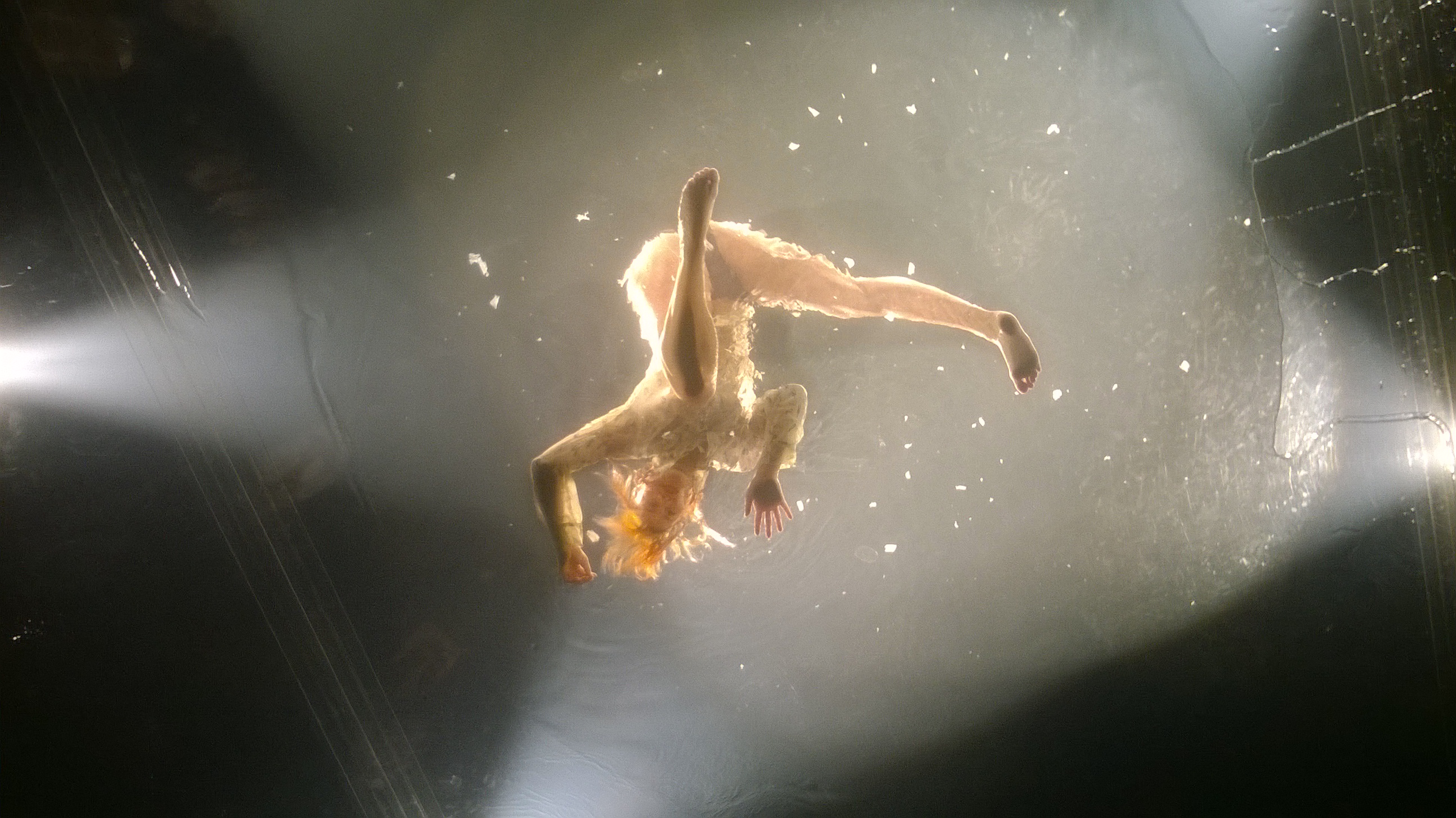 Luckily, not all of Fuerzabruta goes the nightmare route. The water nymphs splashing above the audience are mostly playful and happy. Although even they sometimes hit the plastic floor/ceiling above the audience’s heads with alarming aggression. (As alluring as the loosely clad swimmers were, I did wonder why no men were included in this particular set piece. Is the reason a safety issue regarding weight limits, or something a little more sexist?)