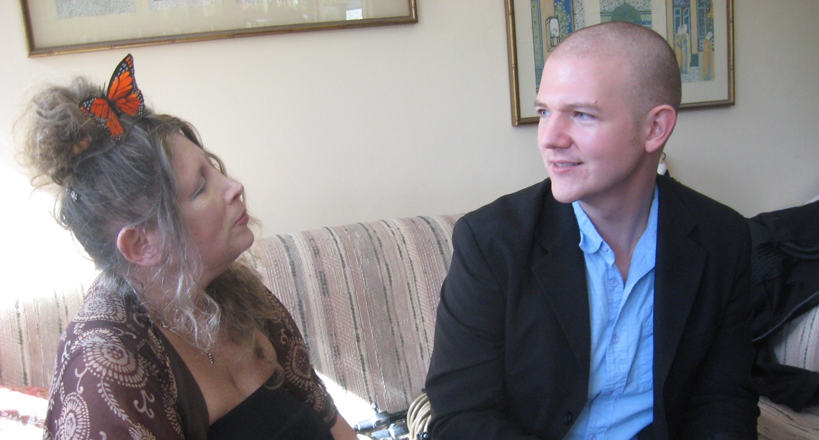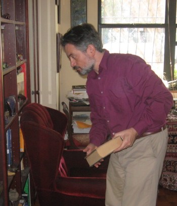 Director Lissa Moira, Music Director Jonathan Fox Powers and Co-Producer (and husband o’ mine) Edward Elder joined me in imparting their views on the Speakeasy Project to the camera in what we jokingly called our “Masterpiece Theater” chair, the burgundy lounge chair Stolis chose to be the interviewee’s seat, and which we moved in front of the bookcase for best framing.