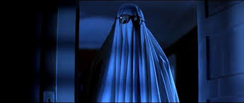 The detective Sam Loomis (named after the boyfriend character in “Psycho”) shoots Michael Myers repeatedly with his gun, and Myers falls over the balcony two stories to the ground below, where he lies spread eagle. You’d think he’d be dead now, right? You know, with finality?