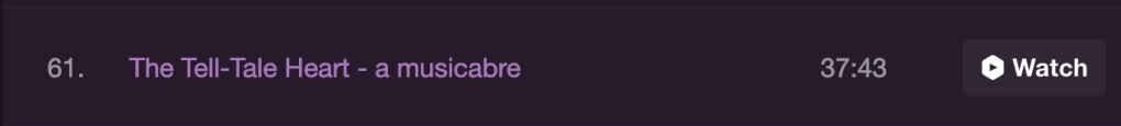 Click here to get to the New York Lift-Off Festival. Find the NEWCOMERS SHORT 1 program. For $10 you can watch a wide variety of short films during the month of July. “The Tell-Tale Heart – a musicabre” is listed at #61 in the NEWCOMERS SHORTS 1 program, showcasing “films from brand new voices”.
