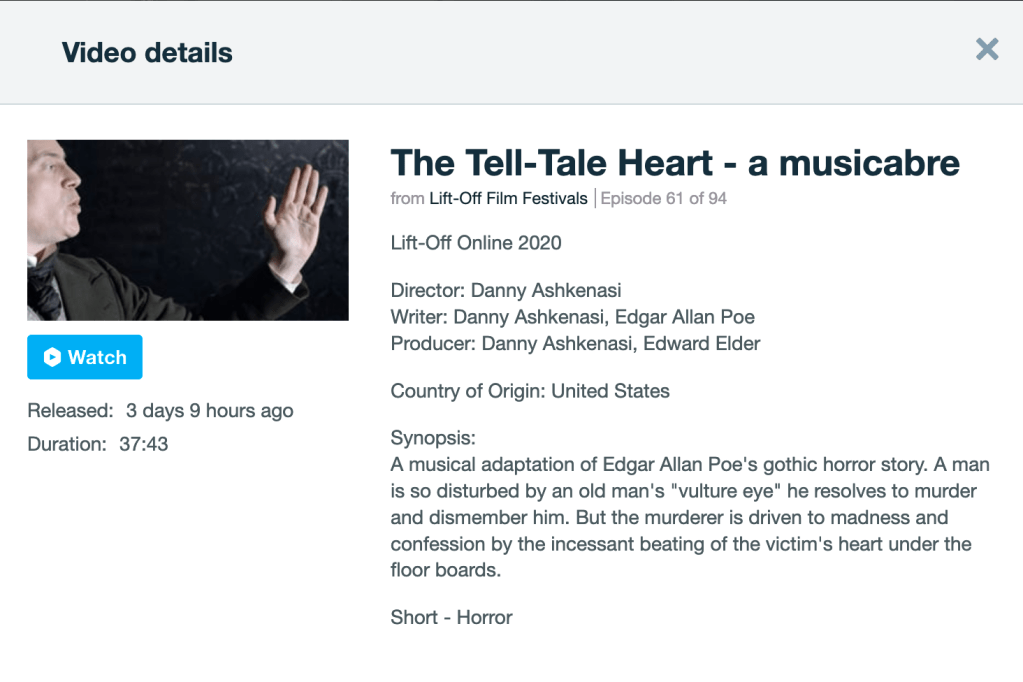 That’s right. You have another chance to watch the well-reviewed “The Tell-Tale Heart – a musicabre” at a film festival. And you don’t need to fly to New York to see it, just like you didn’t need to fly 5 weeks ago to Switzerland, because in the age of Coronavirus, for now, if a film festival is up and running, it’s doing so on-line.