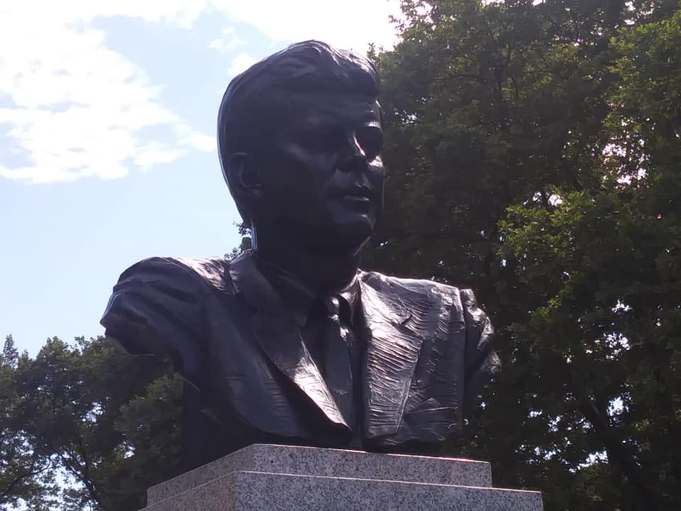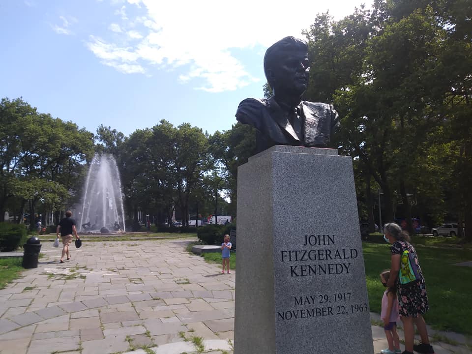 Approaching the fountain from the north, one passes a memorial to JFK.