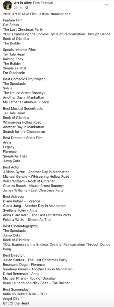 Just like the festival, it was a virtual affair. Cindy Mich, festival founder, convened a Zoom meeting which most of the nominees in all categories joined.
