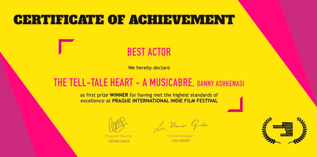 As you might remember… who am I kidding, why would you remember, but I won a Best Actor award from the Prague International Indie Film Festival last March for my performance in “The Tell-Tale Heart – a musicabre“. They give out awards quarterly, and my acting win comes with a cute anecdote you can reread here.