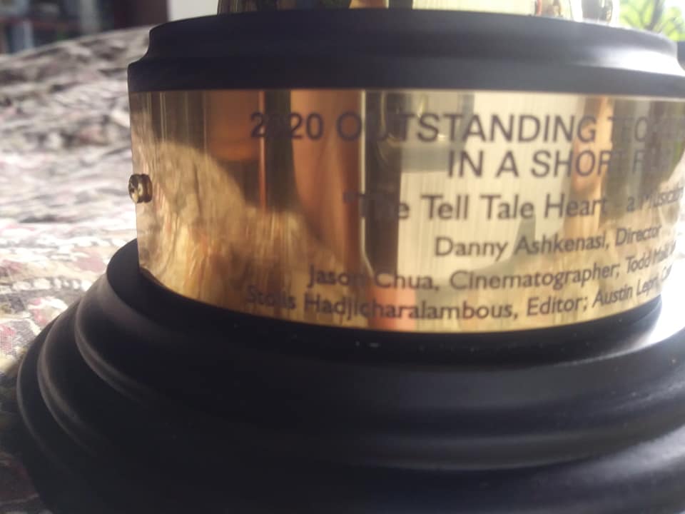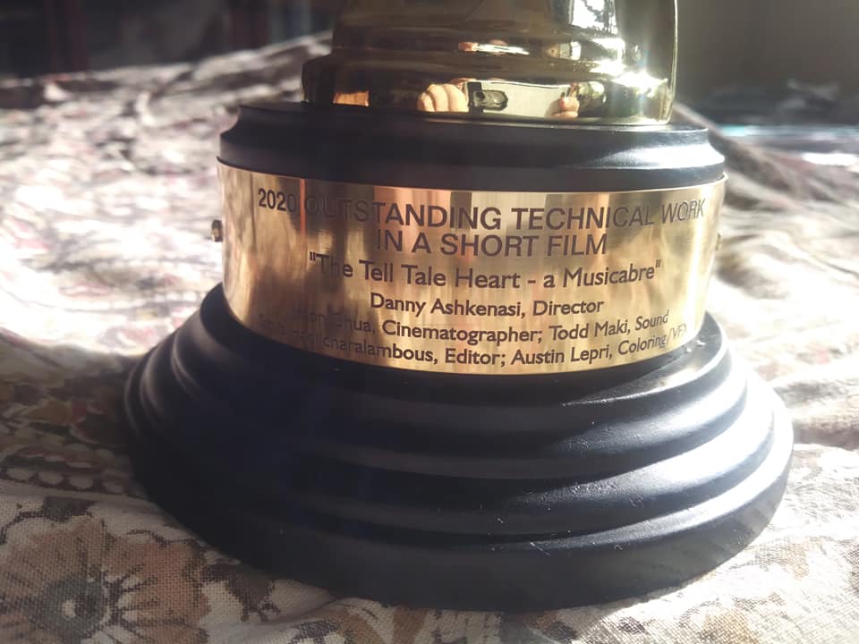 “The Tell-Tale Heart – a musicabre” won for Outstanding Technical Work in a Short Film. This awards the director (me), the cinematographer (Jason Chua), the editor (Stolis Hadjicharalambous), the sound designer (Todd Maki), and the VFX/color artist (Austin Lepri).