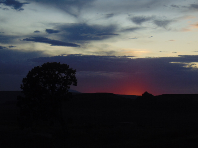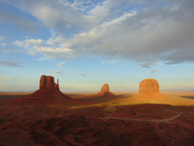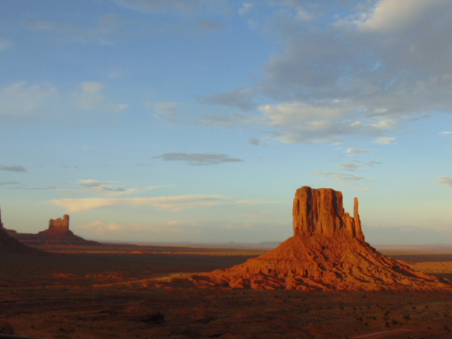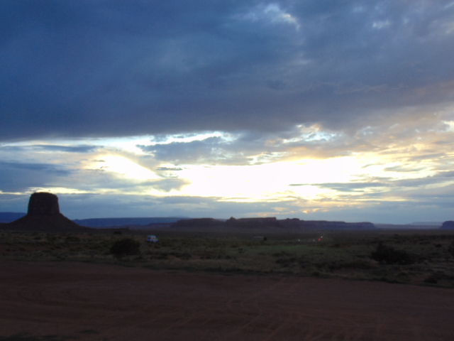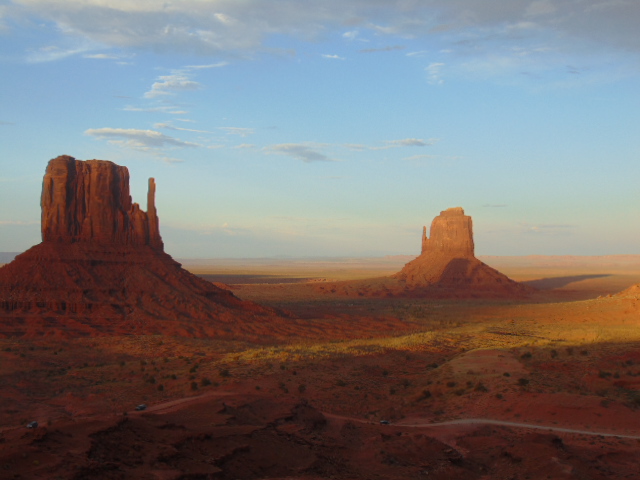 Back at the visitor center terrace, the evening light reveals a trailer perched near the West Mitten Butte.