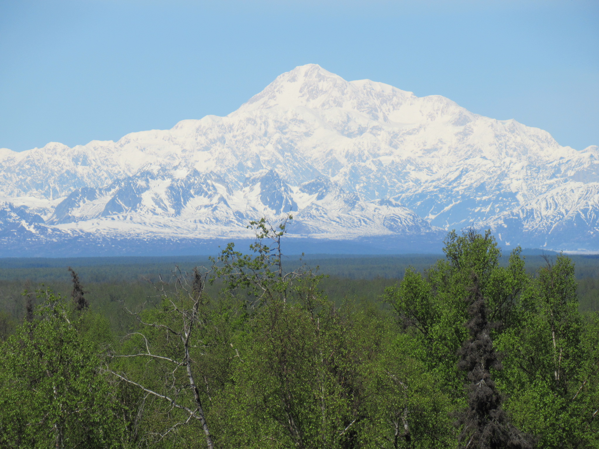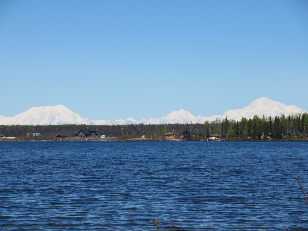 Our first views of Denali were from hundreds of miles away, as it rose over the horizon viewed from the south by a lake.