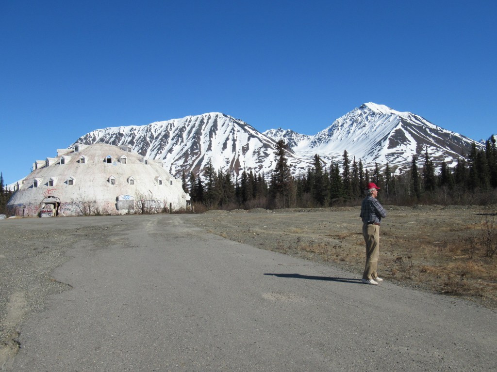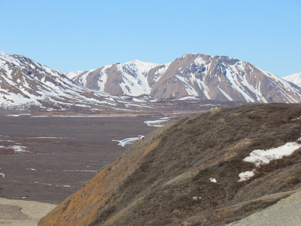 Our closest approach to Denali Mountain. Because the road to Eielson Visitor Center was still closed, we didn’t return to the spot where, 26 years earlier, I stood in front of a large viewing window looking into the fog. Only tape markings on the window indicated where Denali would be if I could see it. A brilliantly sunny day (today and yesterday) made up for that lost opportunity with spectacular, pristine views of Denali (remember, it is generally covered up by clouds 2/3rds of the time).