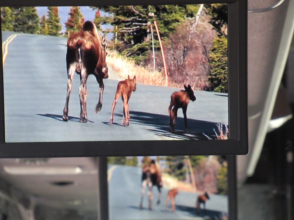 A moose with her two calfs ambled on the road in front of the bus for a while. Our tour guide/driver put them on screens for us in the back of the bus to see.