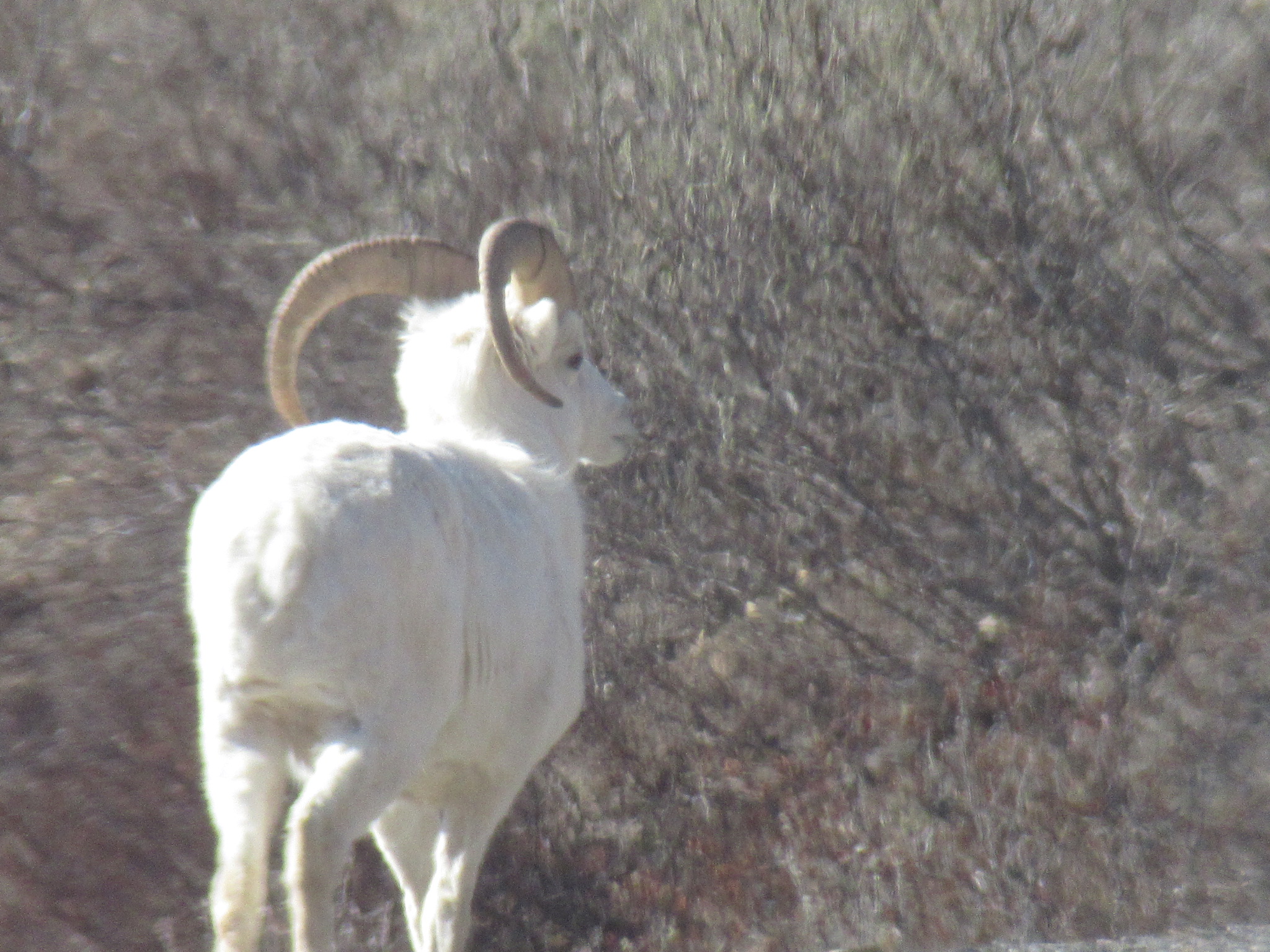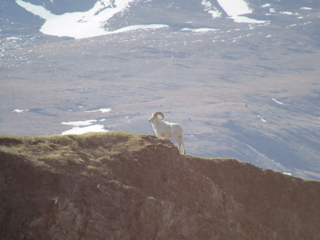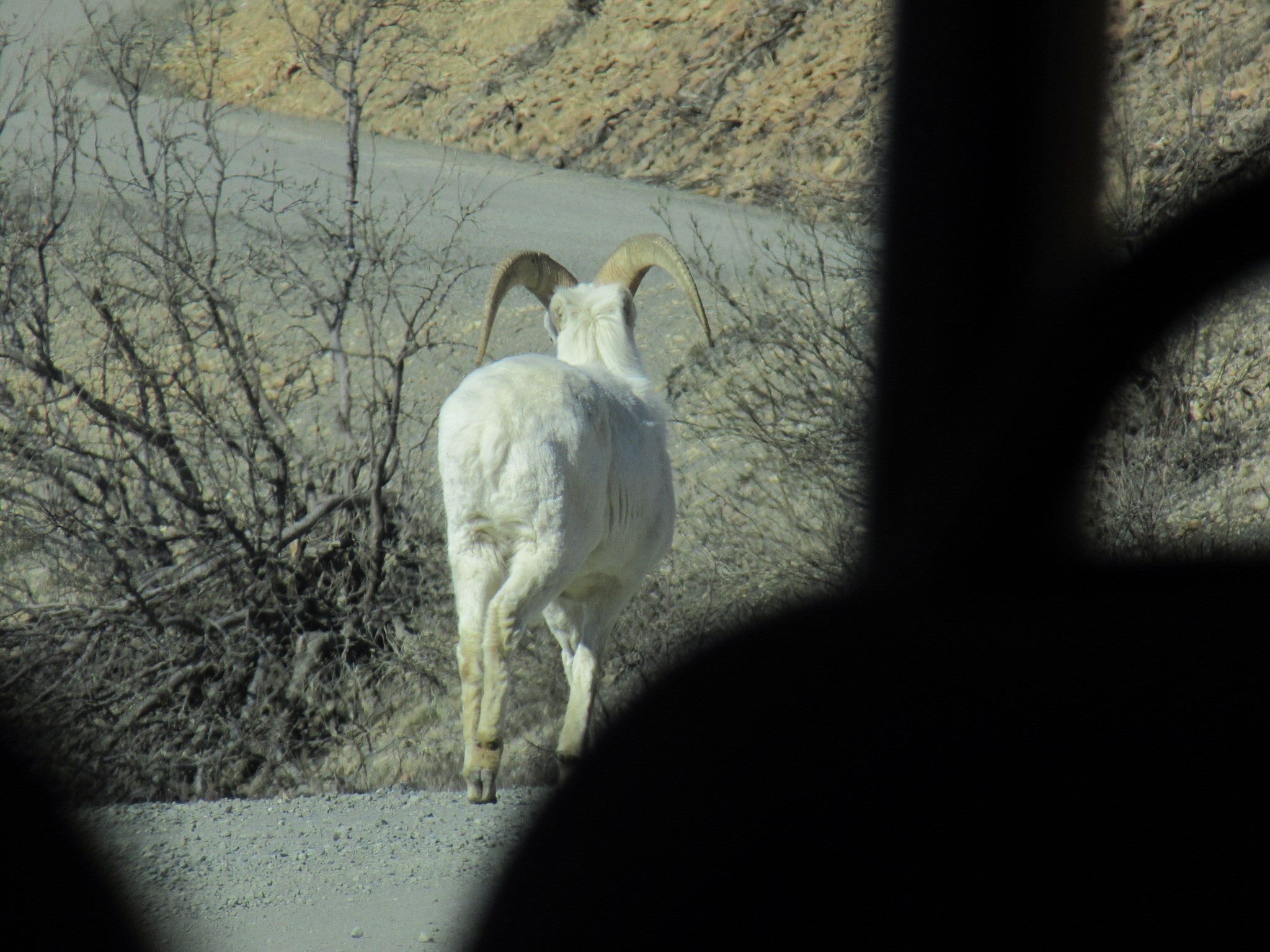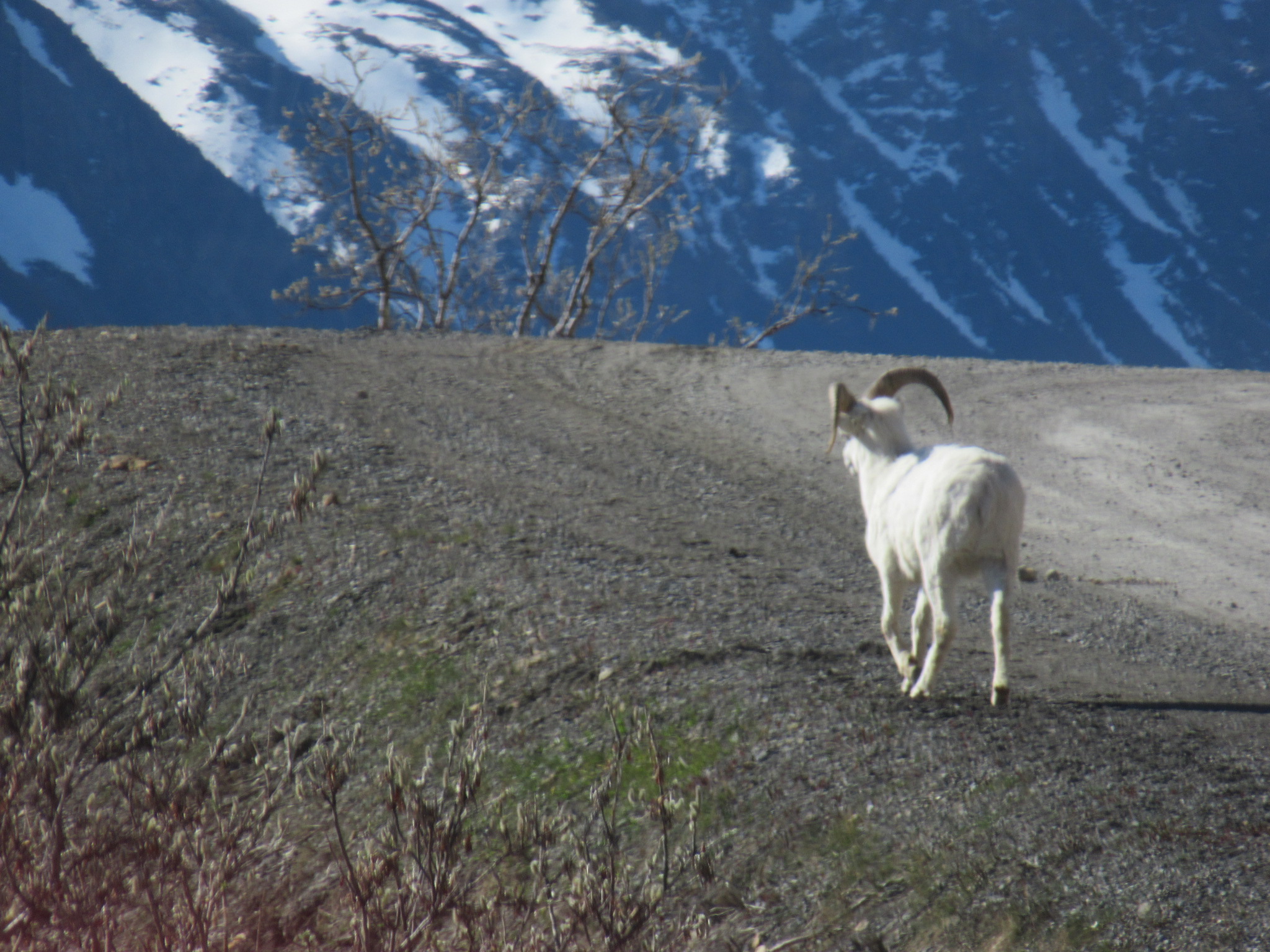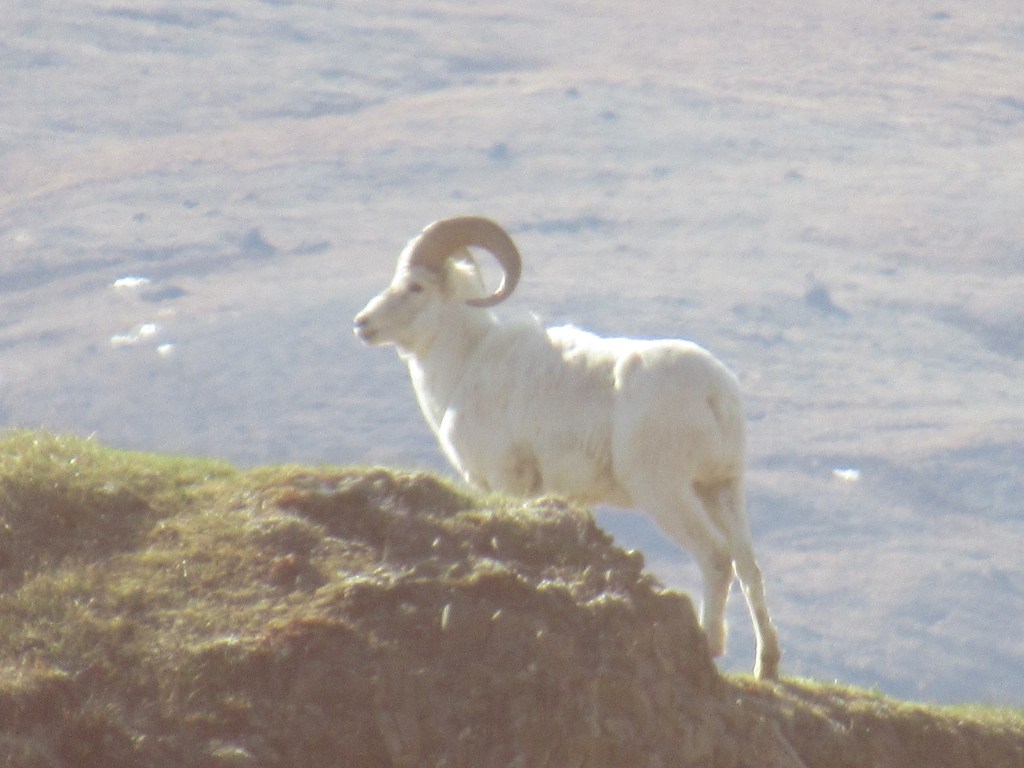 A Dall Sheep sauntered onto the road from the valley and walked ahead of the bus for about half a mile before climbing up the mountain. Our guide told us how unusual it was not only that our tour would see so much wildlife this morning, but that so much of it would join us for a spell on the road, seemingly oblivious to the bus.