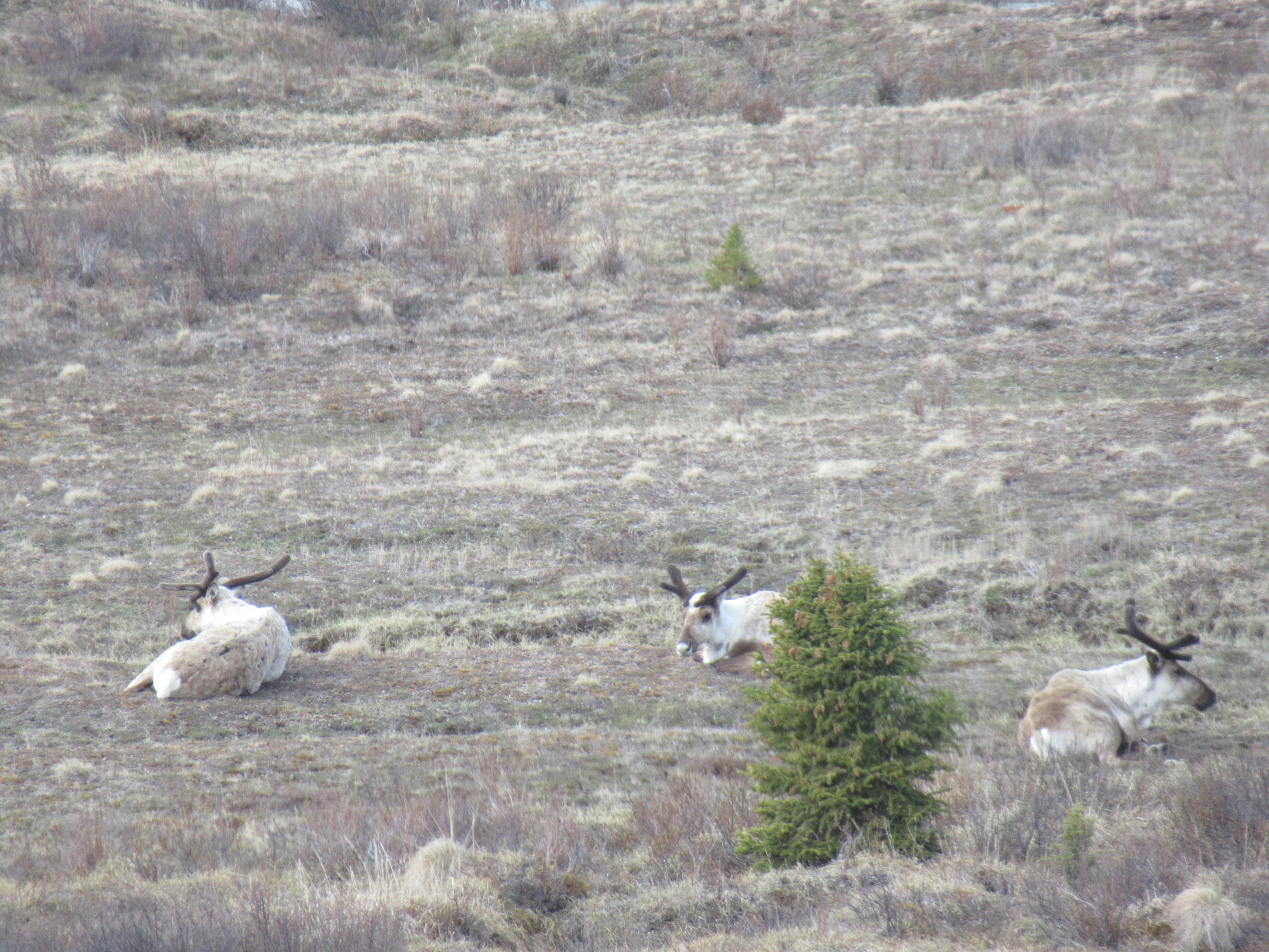 In May a caribou’s antlers are still in the early growing stages.