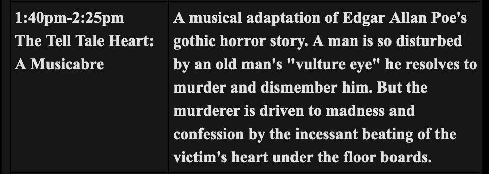 You can take in yet another screening of “The Tell-Tale Heart – a musicabre” this Sunday 1:40pm at the Horror Hotel Film Festival.