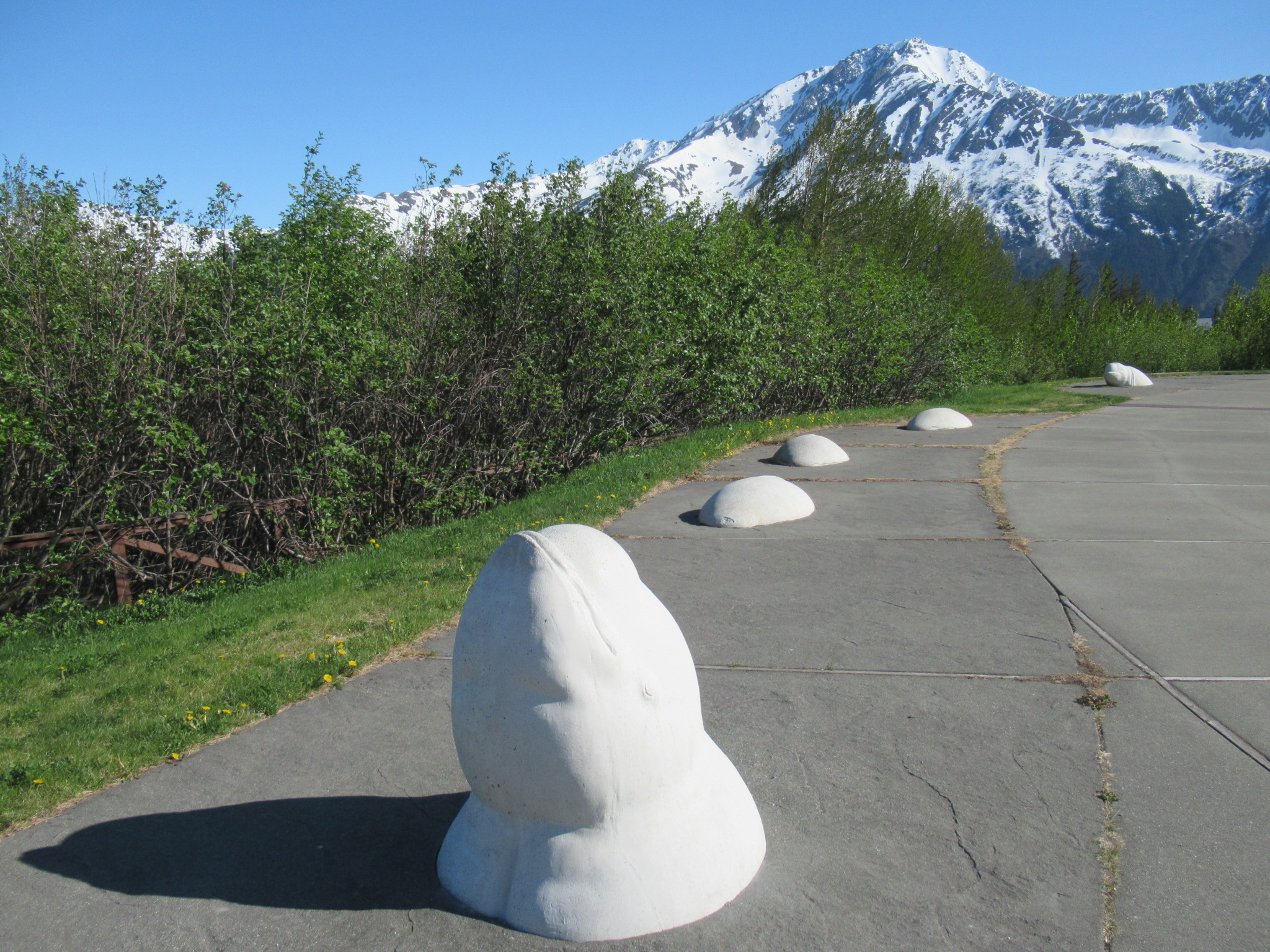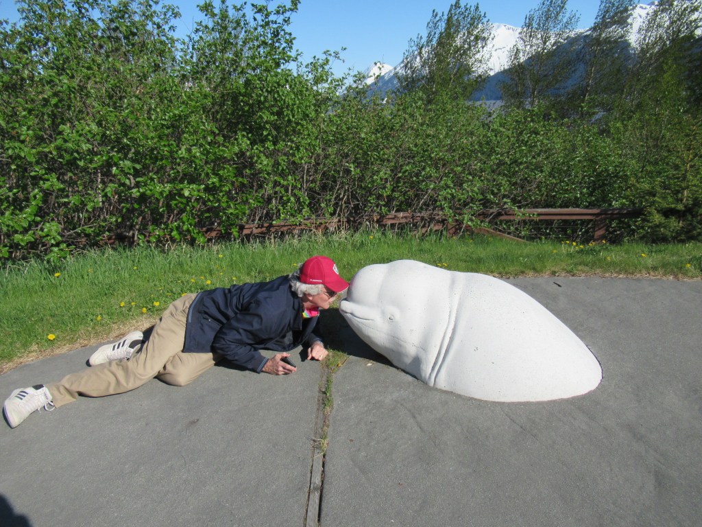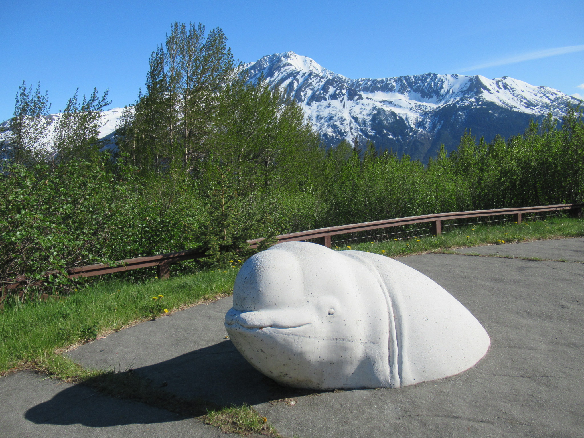 There Beluga whales of the Cook Inlet are a nonmigratory, separate sub-population that is listed as “critically endangered”. We didn’t see any in the waters today, so we settled for the statues of Belugas at Bird Point park.