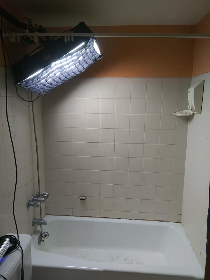 Did these scenes have to be filmed in my own bathroom? Not really. But the producer in me liked that the rental for the space was $0. The director in me and my cinematographer Jason Chua liked the look of the room and the idea of having plenty of time and access to the space to plan out all the shots, even if we both also realized the tub was really too small and the ceiling should ideally be higher and everyone would be in really cramped quarters.