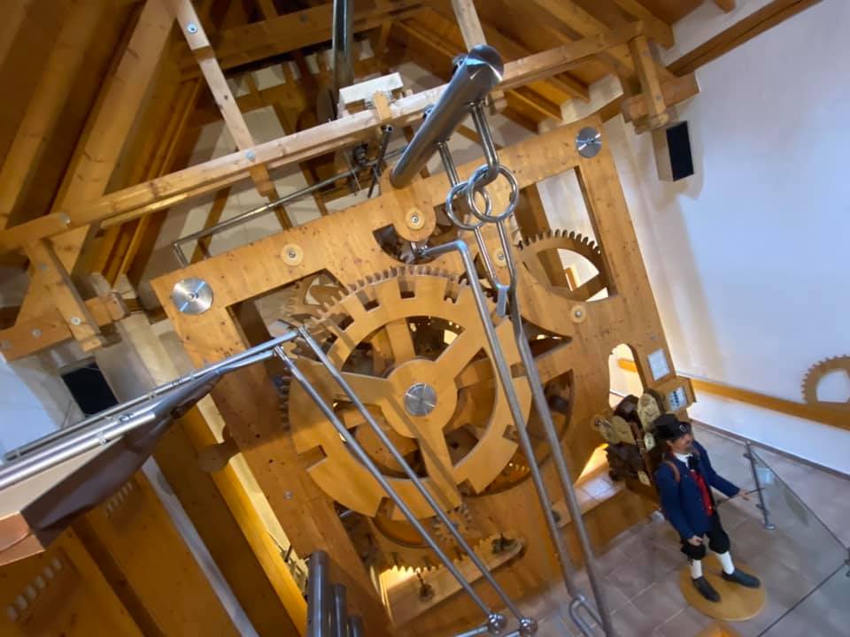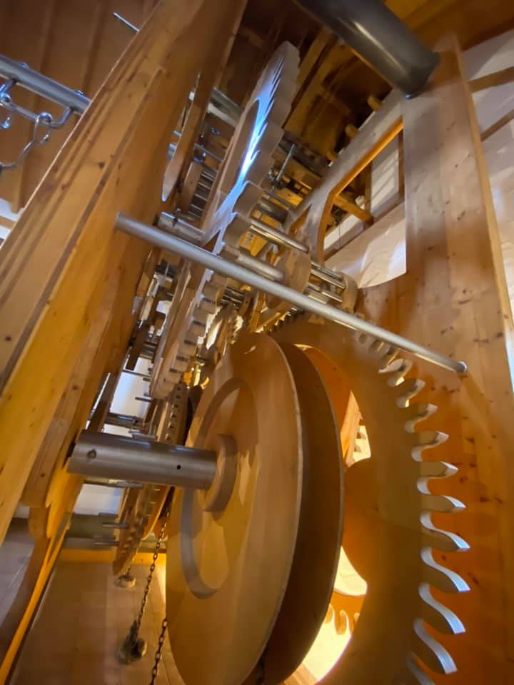 Inside you can see the clockworks arrayed over two stories.