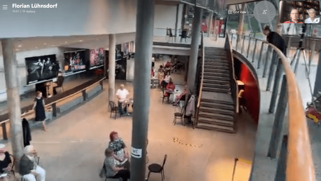 Ed and I got a chance to see “Hexen” performed in July, when the production’s director Florian Lühnsdorf took us behind the scenes and showed us part of a performance via Skype. A Skype screenshot is not exactly the ideal glimpse of a theatrical performance, but from these shots you can get a good idea how the whole space of the foyer, including the balcony above, was used in performance by the two talented performers playing the two witches, and how the audience was safely spaced apart in the space. What was enforced because of extenuating circumstances during a pandemic has yielded an exciting singular performance experience.