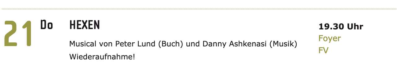 My musical “Hexen” (“Witches”) is back on the boards, or rather the foyer, in Theater Hof in Germany. Originally premiered in the fall of 2020, it is back in repertory this season, performing tonight and sprinkled across the season’s schedule over the next several months as is customary for repertory theaters.
