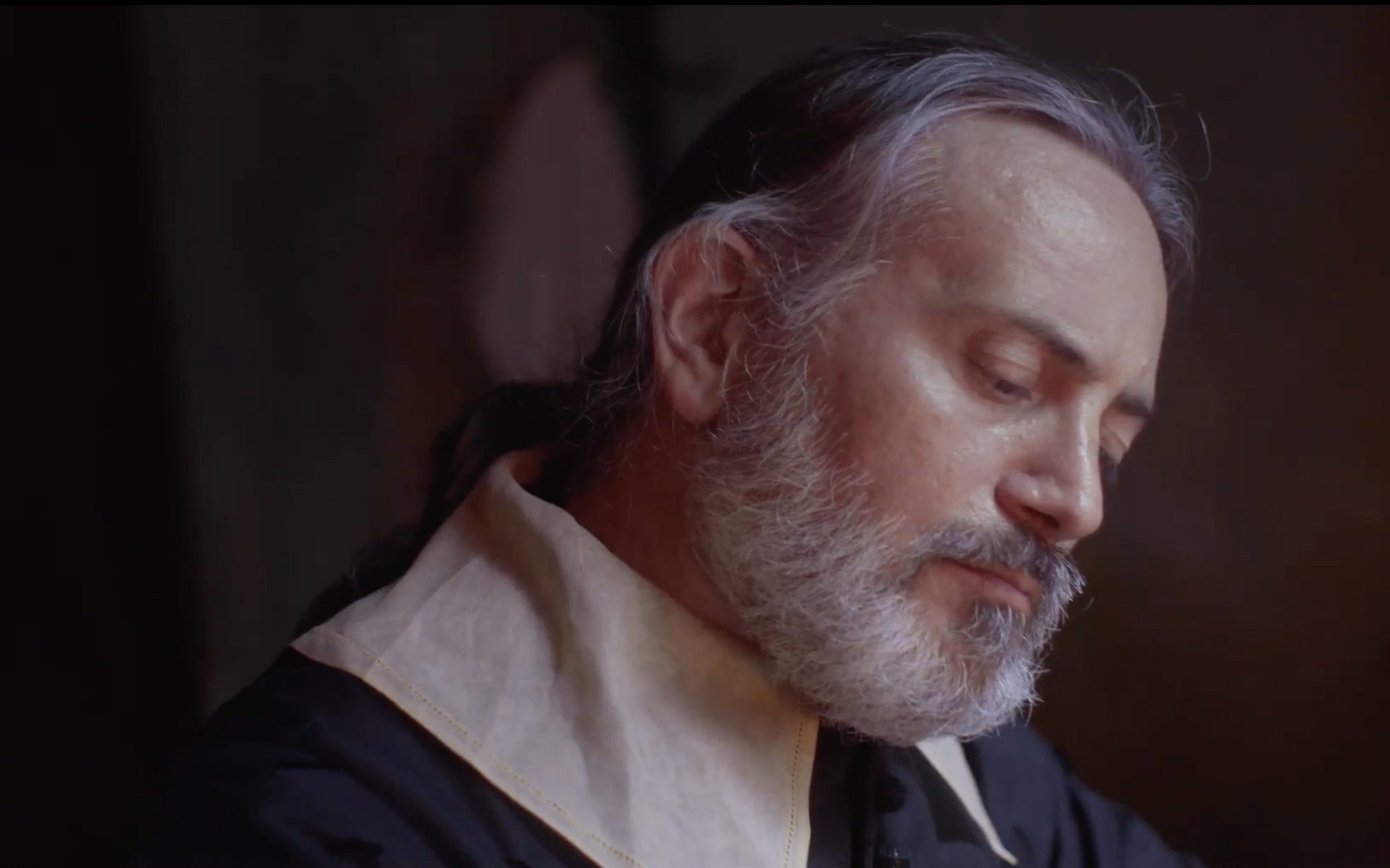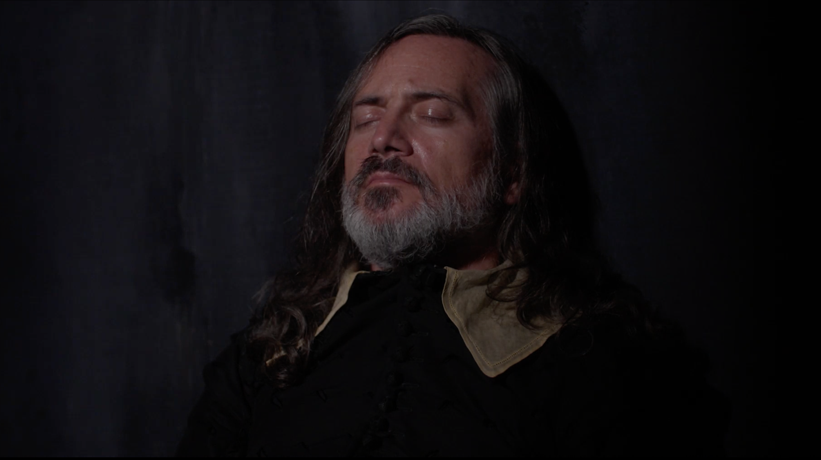 We refer to the example above as “blind vision”. For long stretches the protagonist of Poe’s story is in a completely dark cell. No light whatsoever. How does one visualize that in a seven minute segment without simply keeping everything black and relying solely on sound? Above is our solution, a very specific black and white look achieved by how Jason lit the set and what filters he used in front of the camera lens, followed by a specific way Jimmy turned the image black and white during color grading. We’d also created a black and white look for “The Tell-Tale Heart – a musicabre”, but there our reasons for going black and white were different, and the specifics of lighting, lens and color grading were different, and so its black and white look is also very different, as you can see here.
