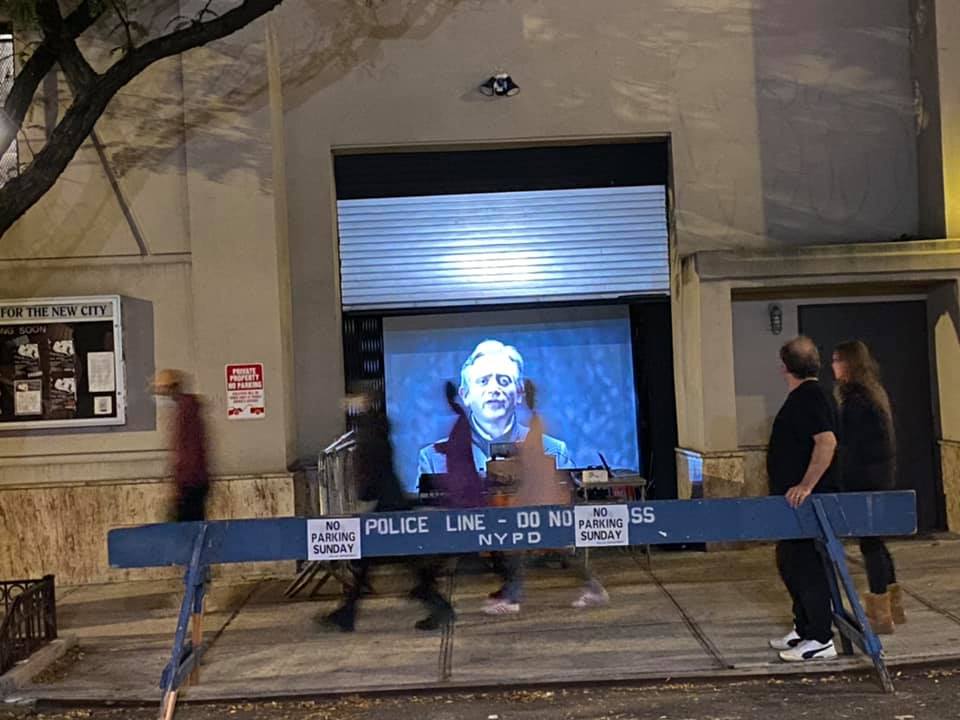 UPDATE 10/31: Here are some pics from tonight’s screening, starting with Ed and me in our Halloween masks. The crowd grew as more and pedestrians were attracted by the sights and sounds of the screening. The response at the end was very enthusiastic.