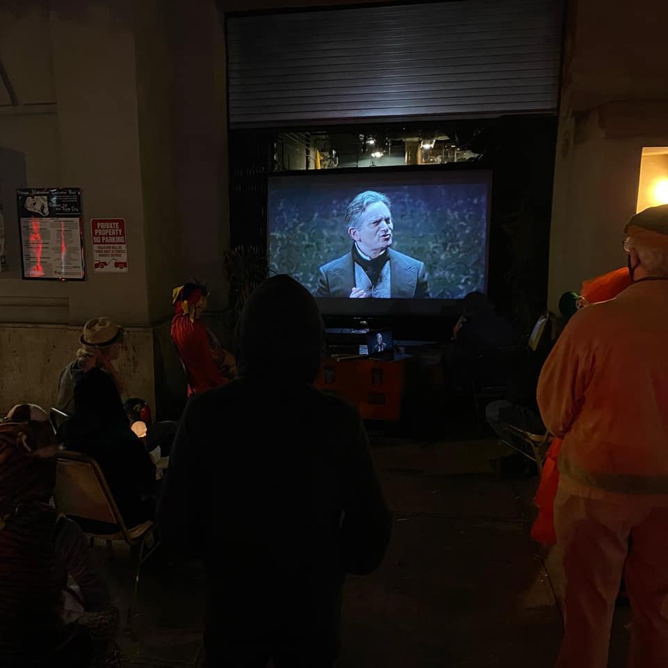 We tested out the screen and sound projection tonight (see the pictures below), and it should be a fun, effective and unusual way to experience 37 minutes of gothic movie musical madness. It’s not Tell-Tale’s first New York screening, that would be New Filmmaker’s NY’s March 2020 screening, which had been scheduled for the 2nd Avenue Anthology theater but had to be moved on-line because of Covid. Many more festivals local and world-wide screened “The Tell-Tale Heart – a musicabre”, most on-line, or if not on-line, unreachable for me do to travel restrictions. In fact, thanks to Covid’s long reach, this will be the first time Tell-Tale will screen in a physical space in Manhattan, and only the fourth time I will get to experience an in-person screening. It being an outdoor presentation will make it extra safe in a city with very high vaccination rates. It being Halloween night in the East Village however should make it an extra freaky fun viewing experience. I’m excited about it and hope you will join us.