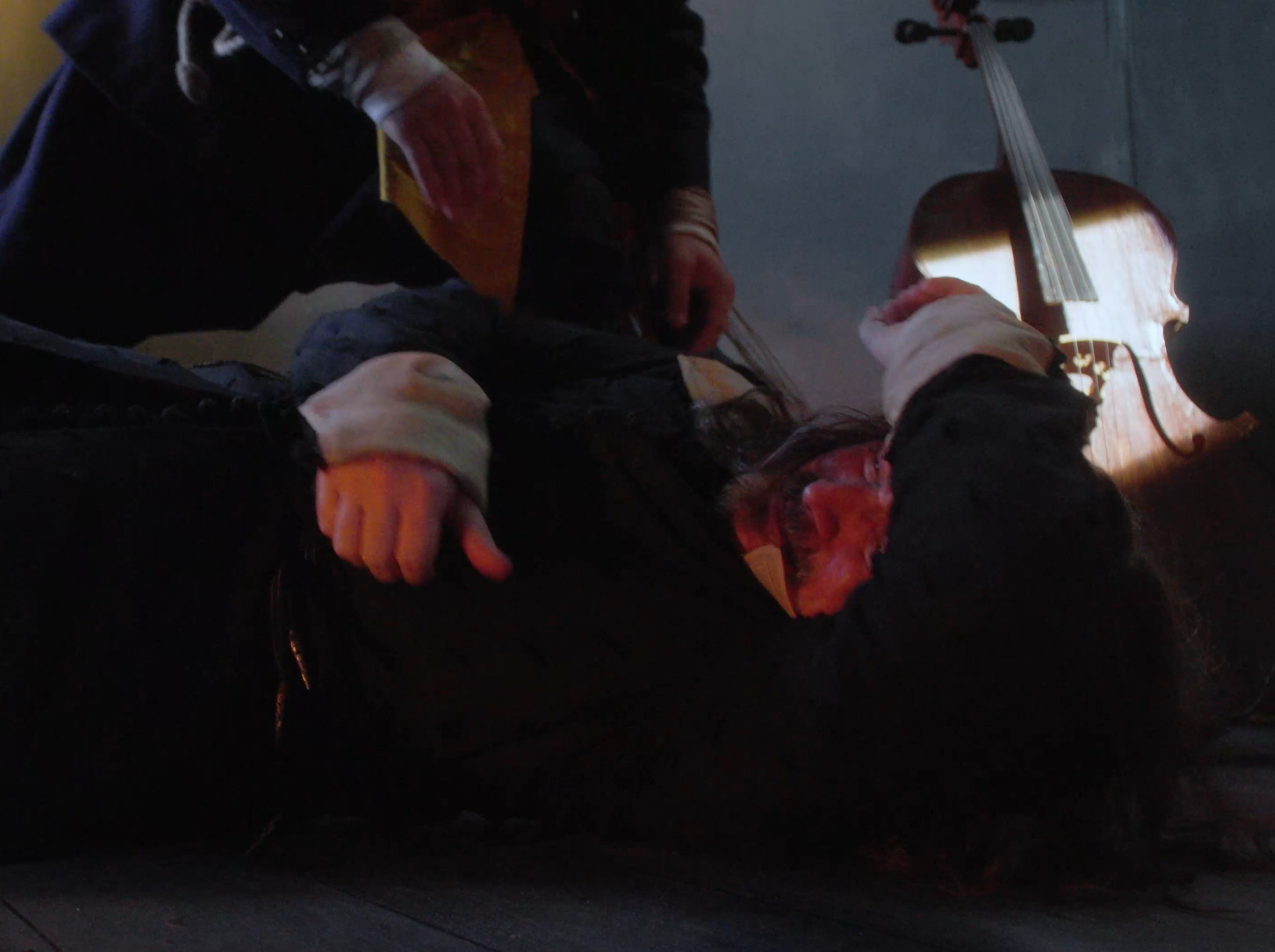In the above shot the cello can be seen in the background while the composer is thrown to the floor by soldiers of the Inquisition. The composer is receiving a few well placed kicks to the gut. But the cello will be the next and even more woeful target of the arresting officer’s wrath.