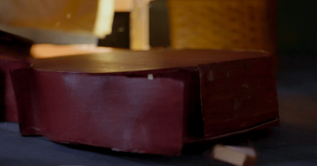 I’ve already posted about shooting the garret scene where the soldiers arrest the protagonist of “The Pit and the Pendulum – a musicabre”, and the bloody accident that occurred that day on set. Well, it wasn’t just my forehead that got split, the prop cello was slated for even worse treatment, albeit in its case that bit of carnage was planned.