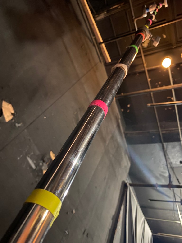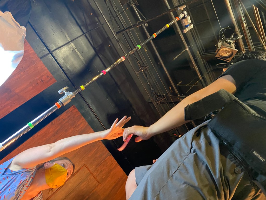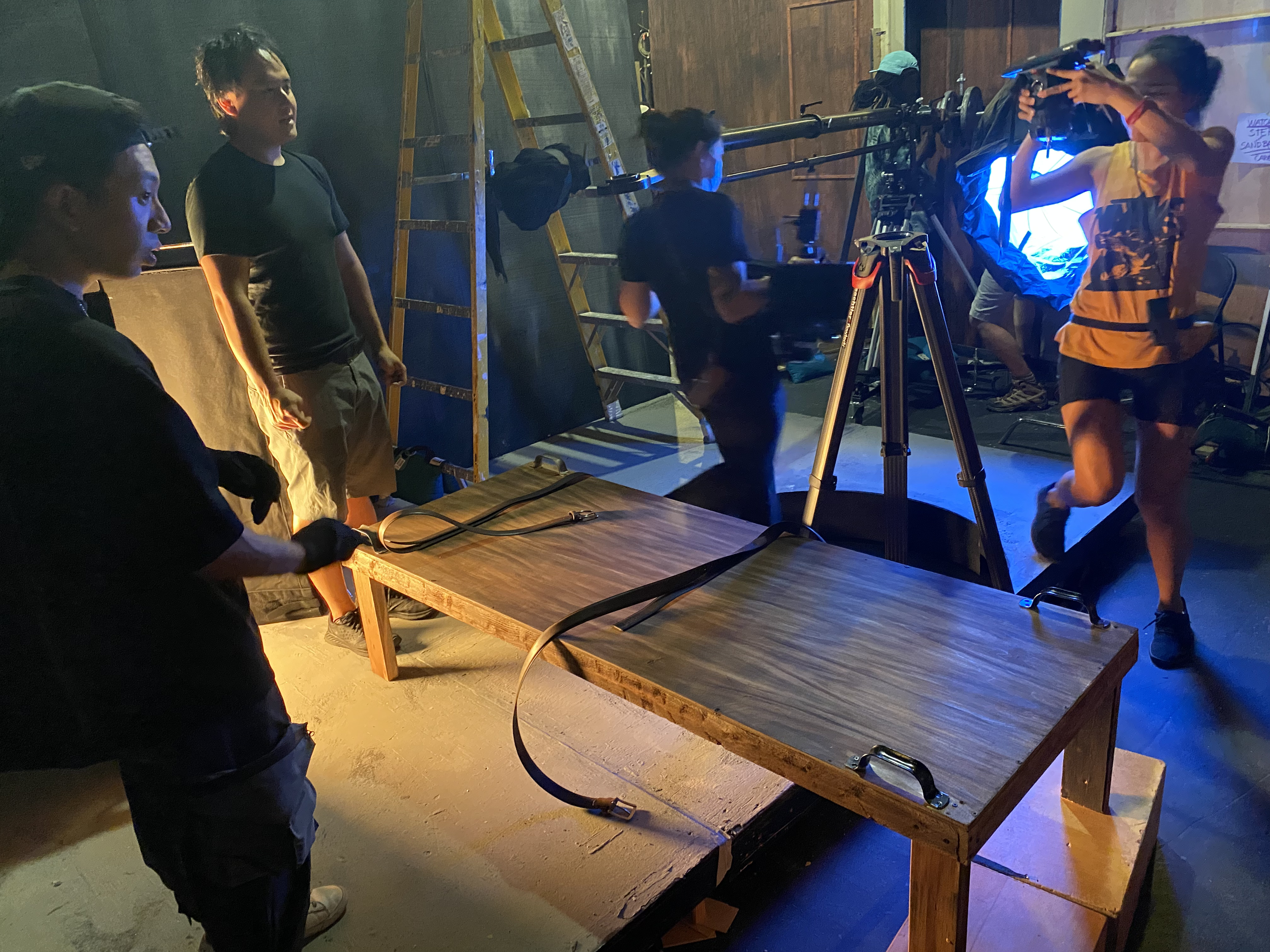 Why is director of photography Jason Chua attaching sticky color strips to a pole? Those color strips were placed on two poles placed left and right from the rack, to gave us a visual guide to where the pendulum was swinging at any particular moment. Like I already said, the pendulum itself would be filmed separately and added to the scene via editing and VFX work. But while we shot the protagonist’s reactions we had to know where exactly at any moment in the five minute scene the pendulum was located.