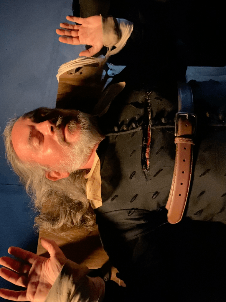 Oozing just so? Because the pendulum does start cutting through the doublet and the shirt underneath and then the protagonist’s skin. We had two versions of the doublet for me to wear. The uncut one and the cut and bloodied one. There was a third doublet too, which would be worn by a pillow form fitted to double as my torso, for the shots of … well, I’ll get to that another time.
