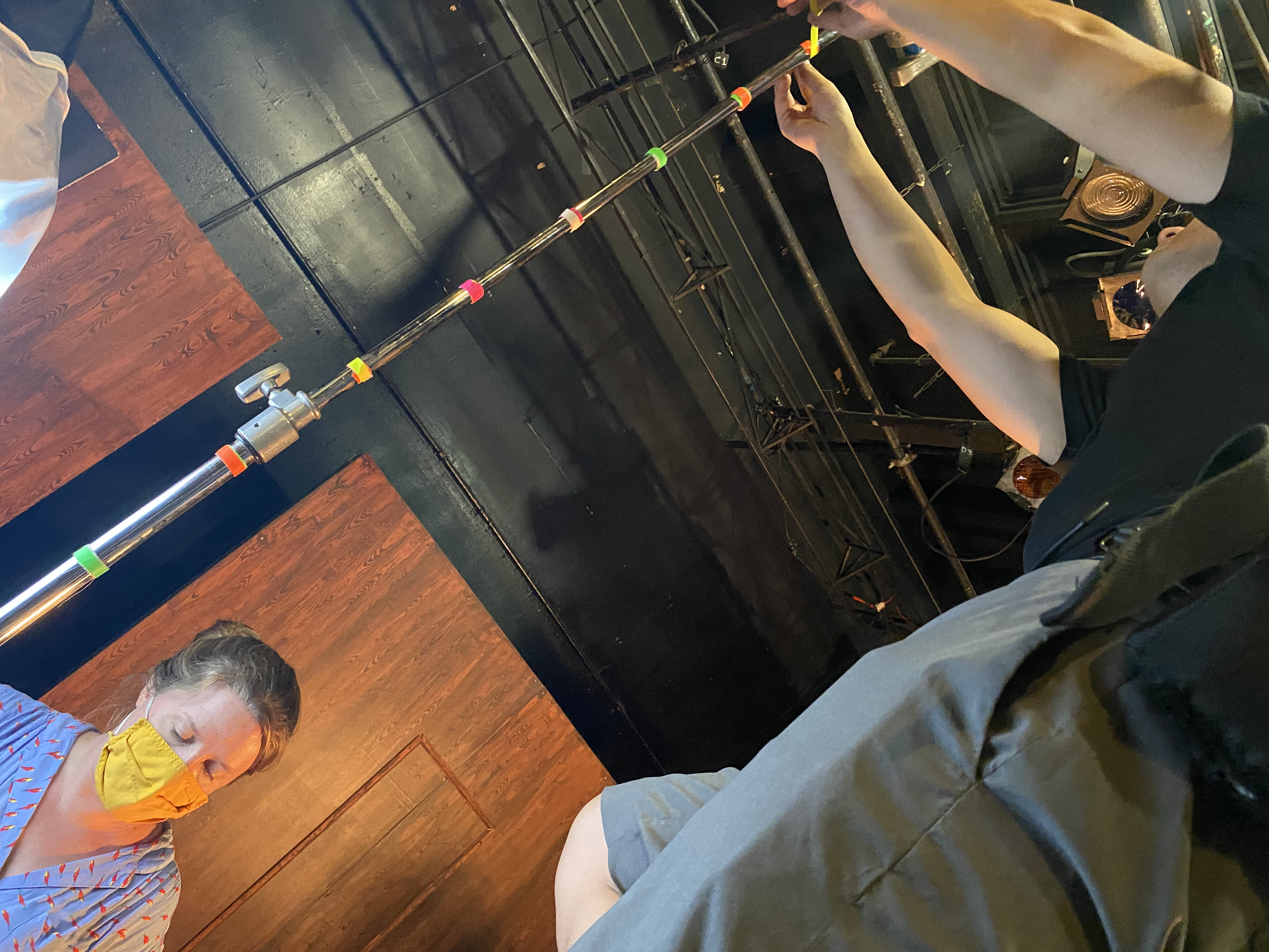 Below is a video of me indicating the pendulum’s progress with a tennis ball on a stick, while the soundtrack for the whole scene plays. I did this demonstration less for myself than for the whole crew, so we all could place the pendulum in our mind’s eye when we would later shoot segments without any visual guide other than my eyeline or a string of lights (more on that further down).