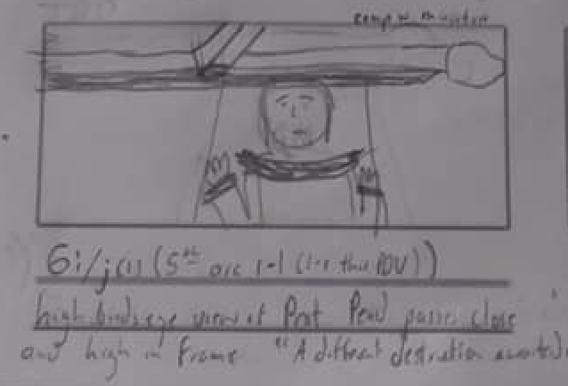 Each swing of the pendulum and whether it was swooping past me right to left or returning left to right was meticulously noted in the script (in red) and in the storyboards. I’ll share details from both: