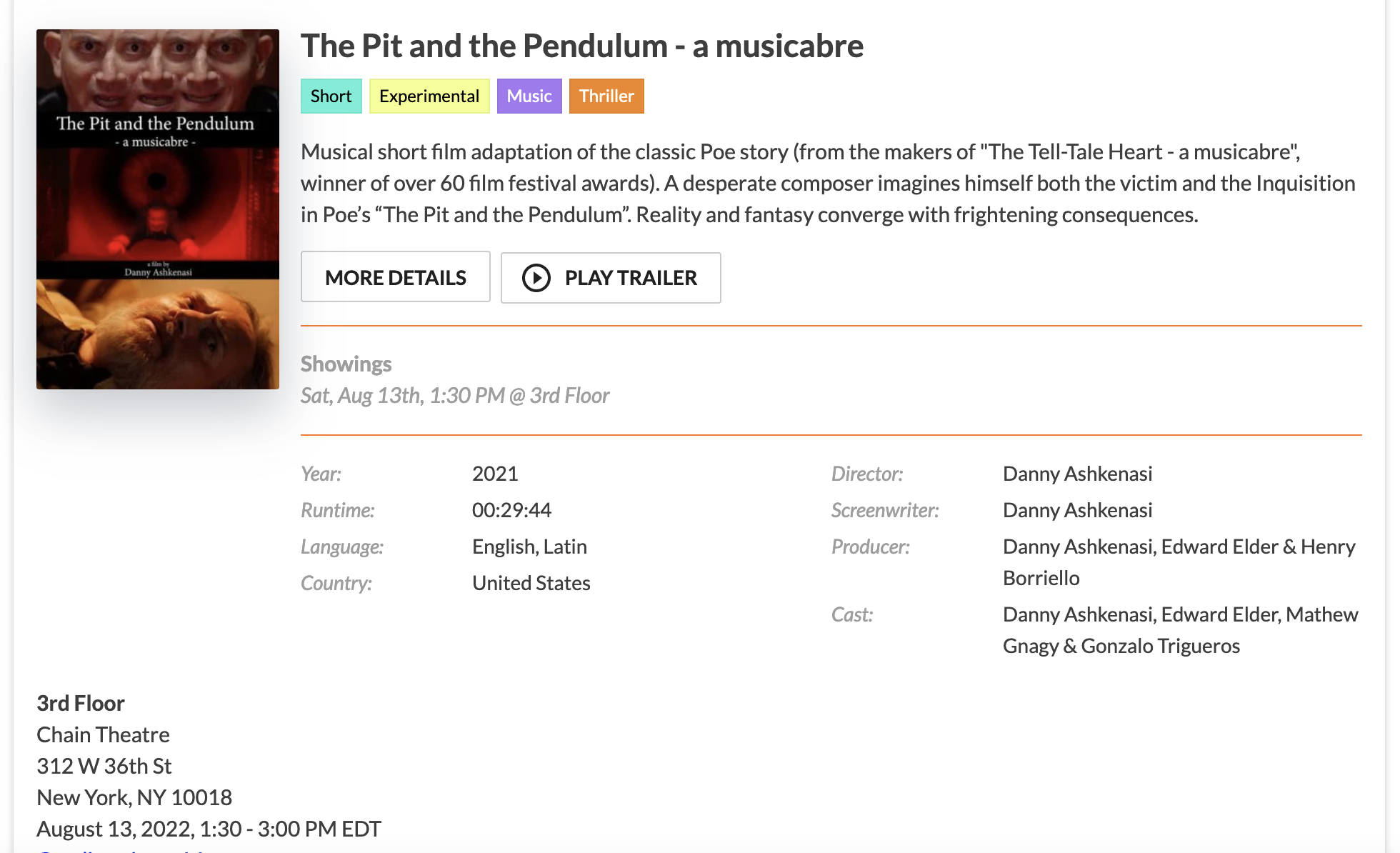 The film, classified by the festival as a short, musical, experimental and a thriller, will screen August 13, 1:30pm at the Chain Theater in 312 West 36th street in Manhattan. You can order your ticket here. (FYI, the listing four shorts collected in the “Sound and Music” block is alphabetical, and not necessarily the order of screening, so “The Pit and the Pendulum – a musicabre” may screen first or last or somewhere in between, I don’t know – i.e. don’t be late. π )
