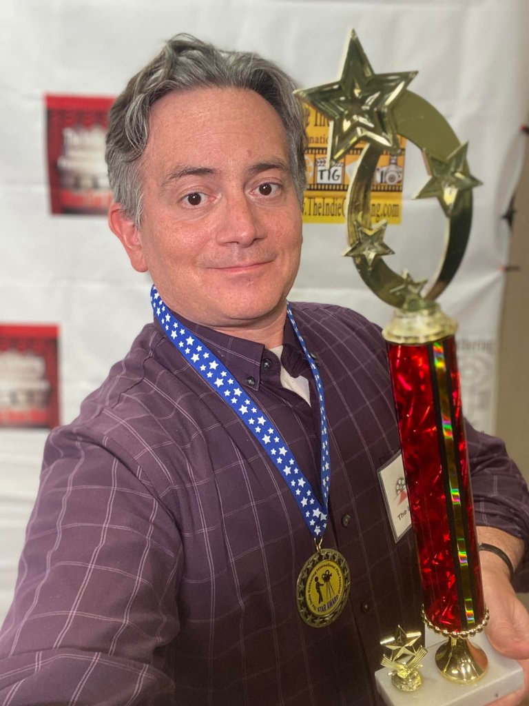 This is me with Eric William, host of Saturday Night Theater, where he interviews “the best independent film makers, directors, producers, composers, and actors from all over the world.” So he naturally interviewed me too. 😉