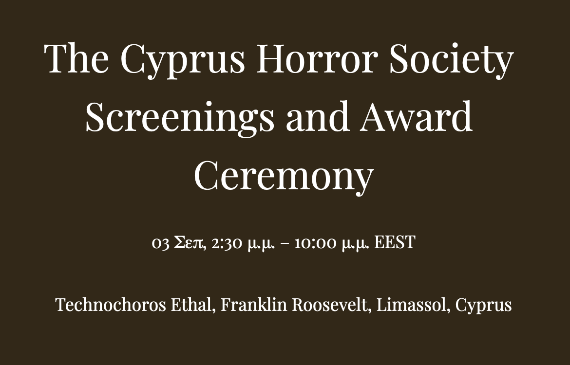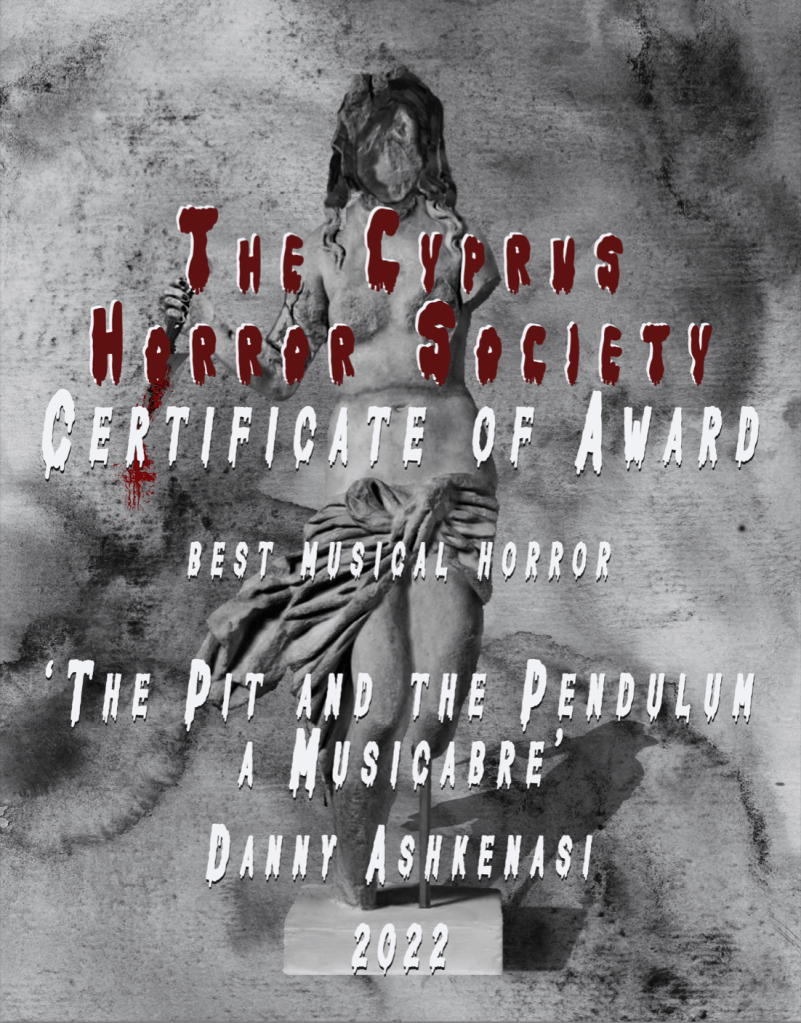 The Cyprus Horror Society will screen an award-winning selection of short films this Saturday, including yours truly’s “The Pit and the Pendulum – a musicabre“, which won awards for Best Musical Horror, Best Costume Design and Best Film Score.