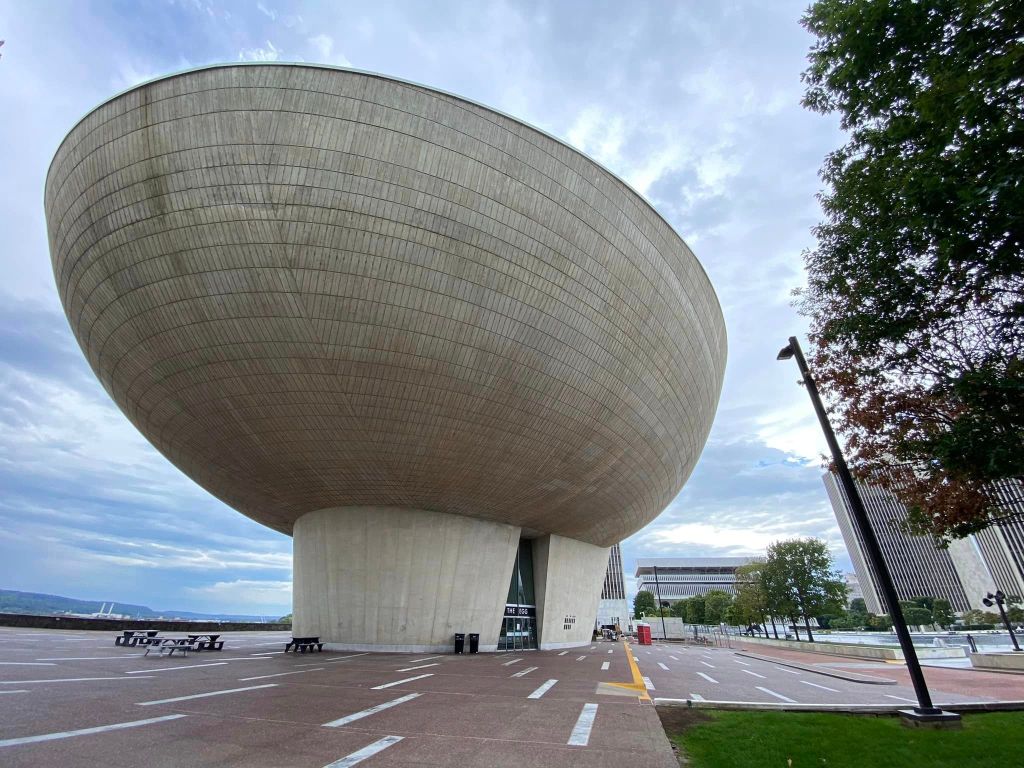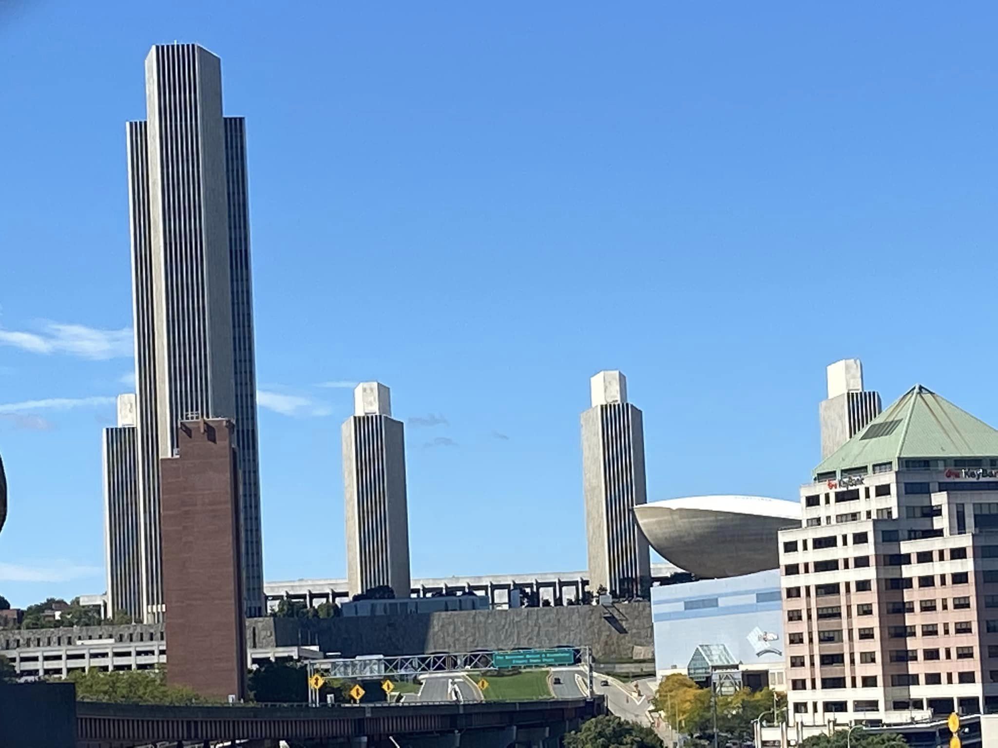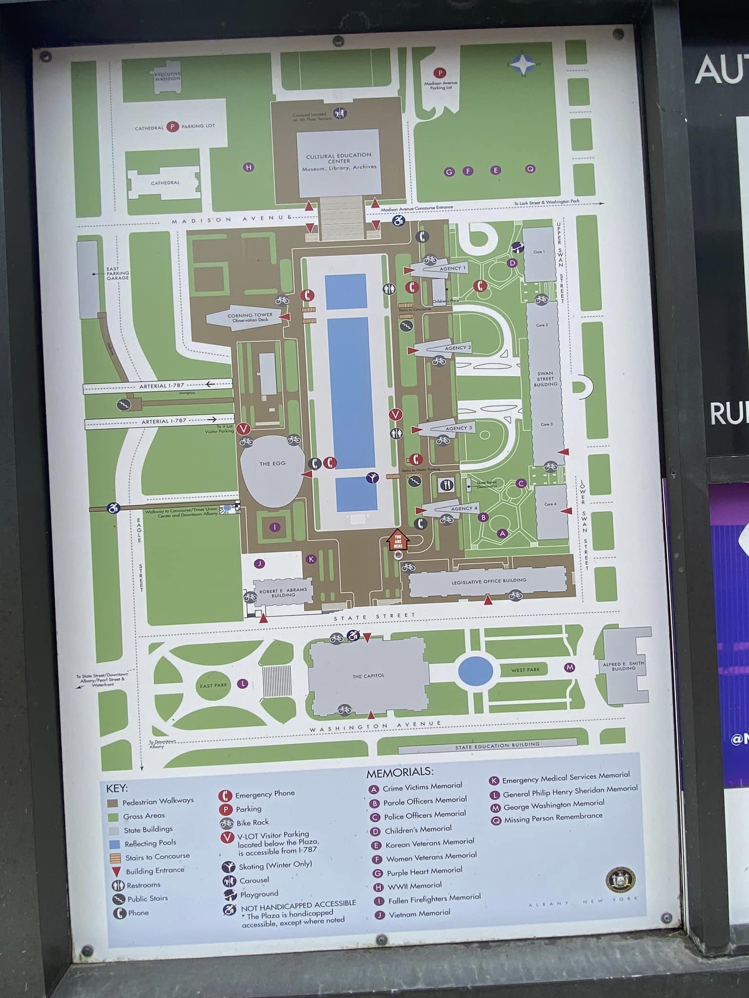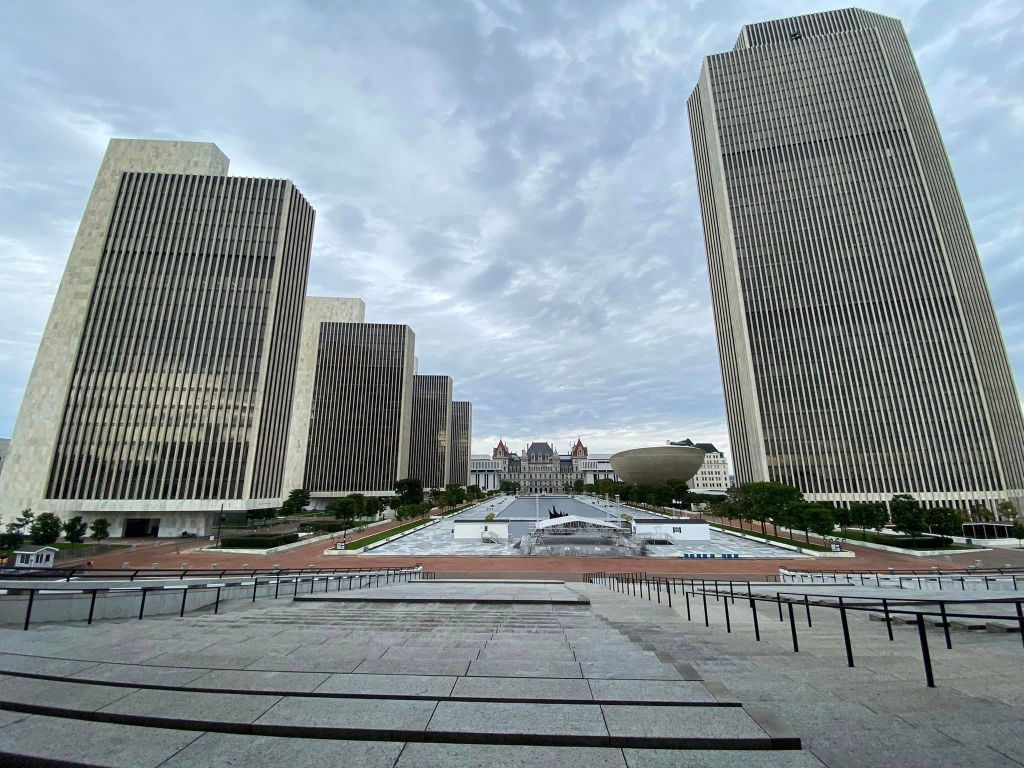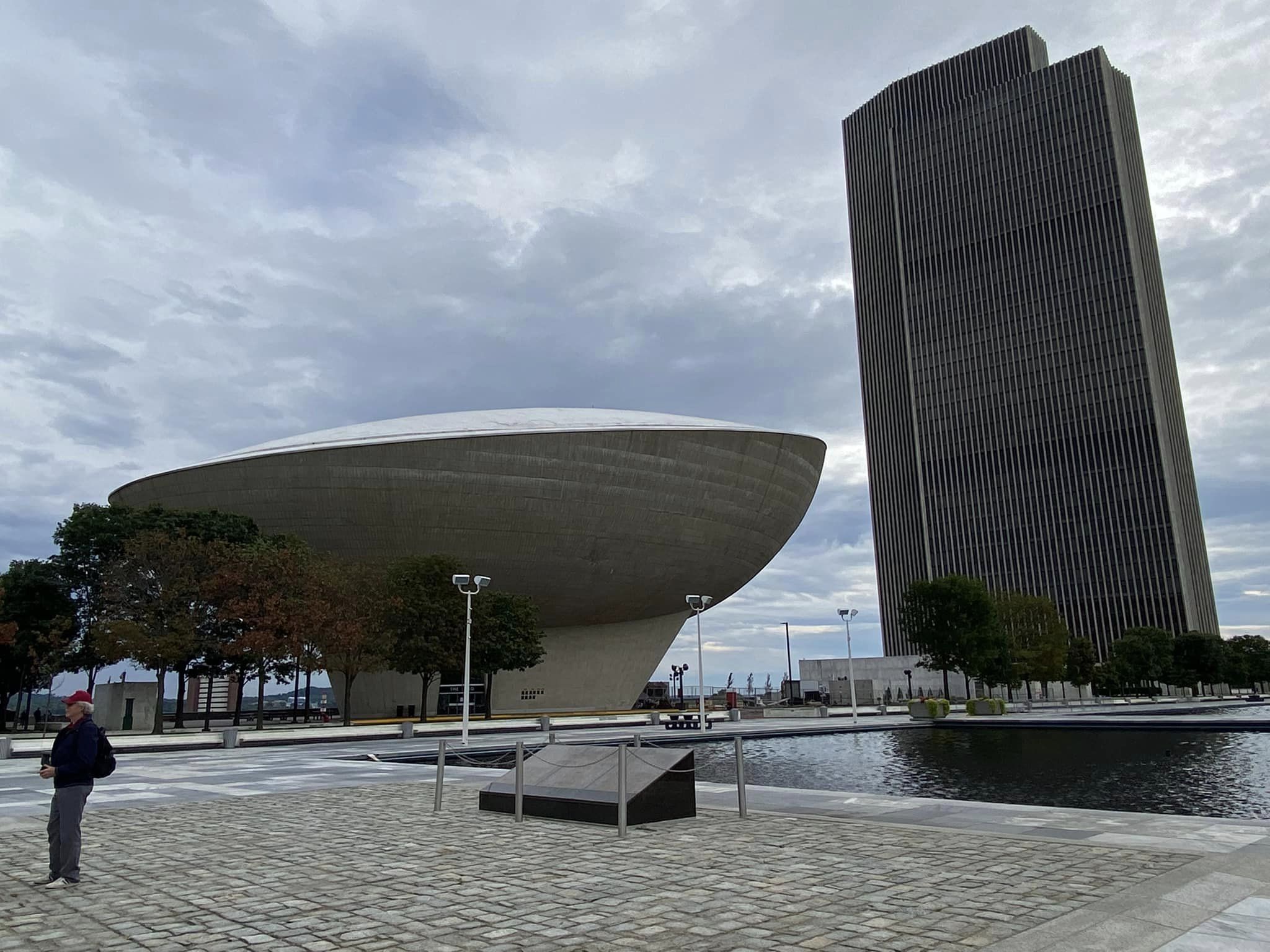 Empire State Plaza’s brutalist architecture rearing its forbidding forms.