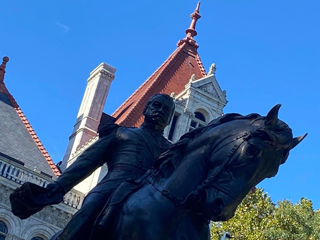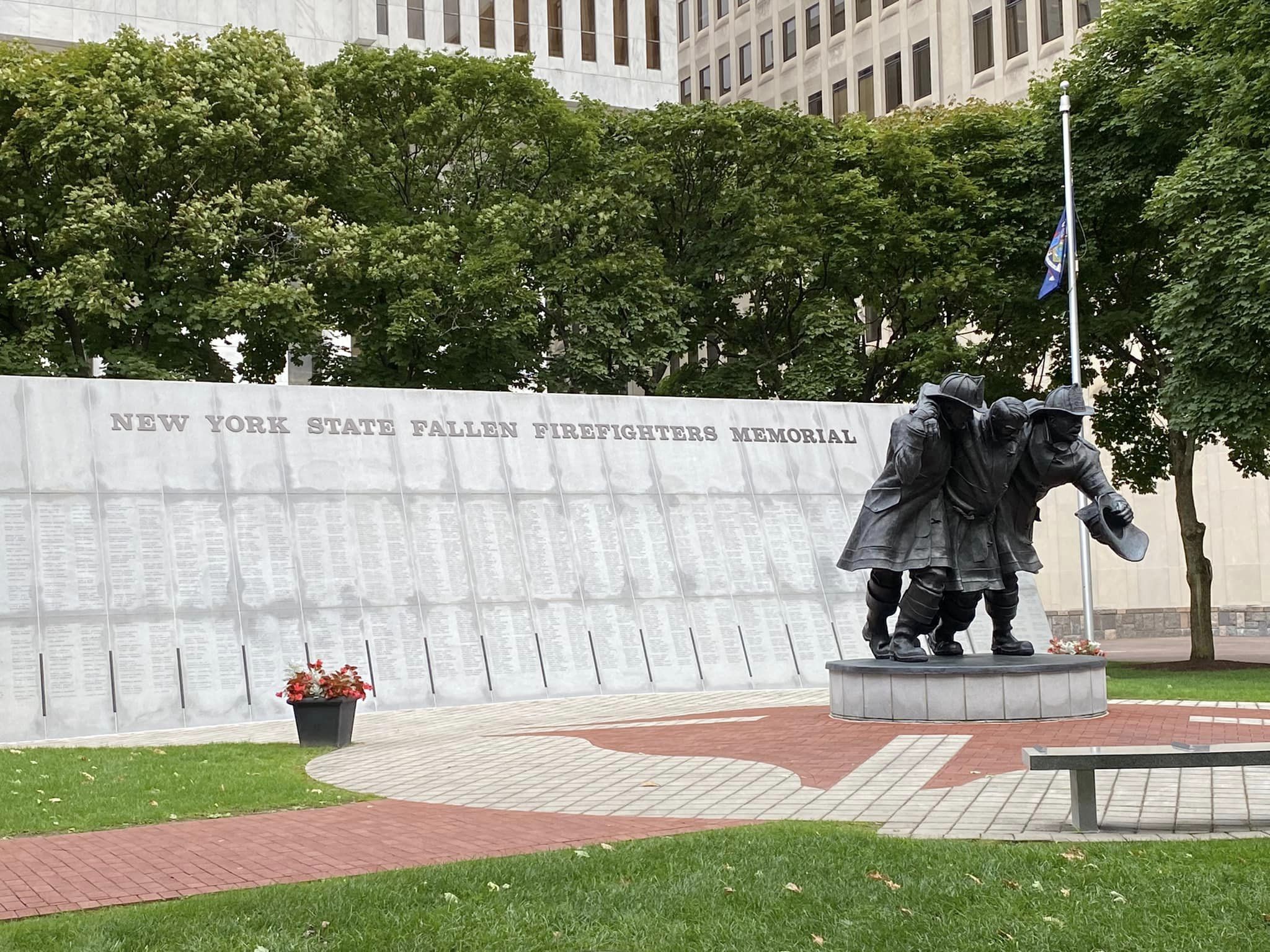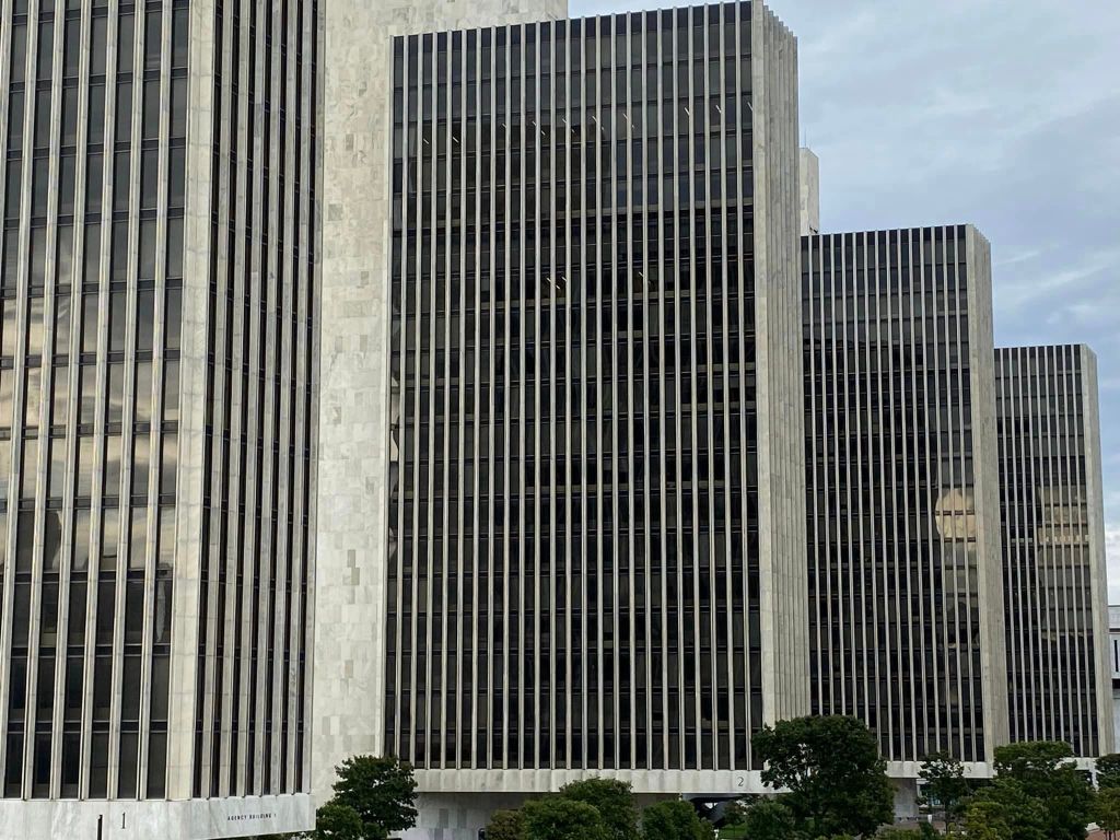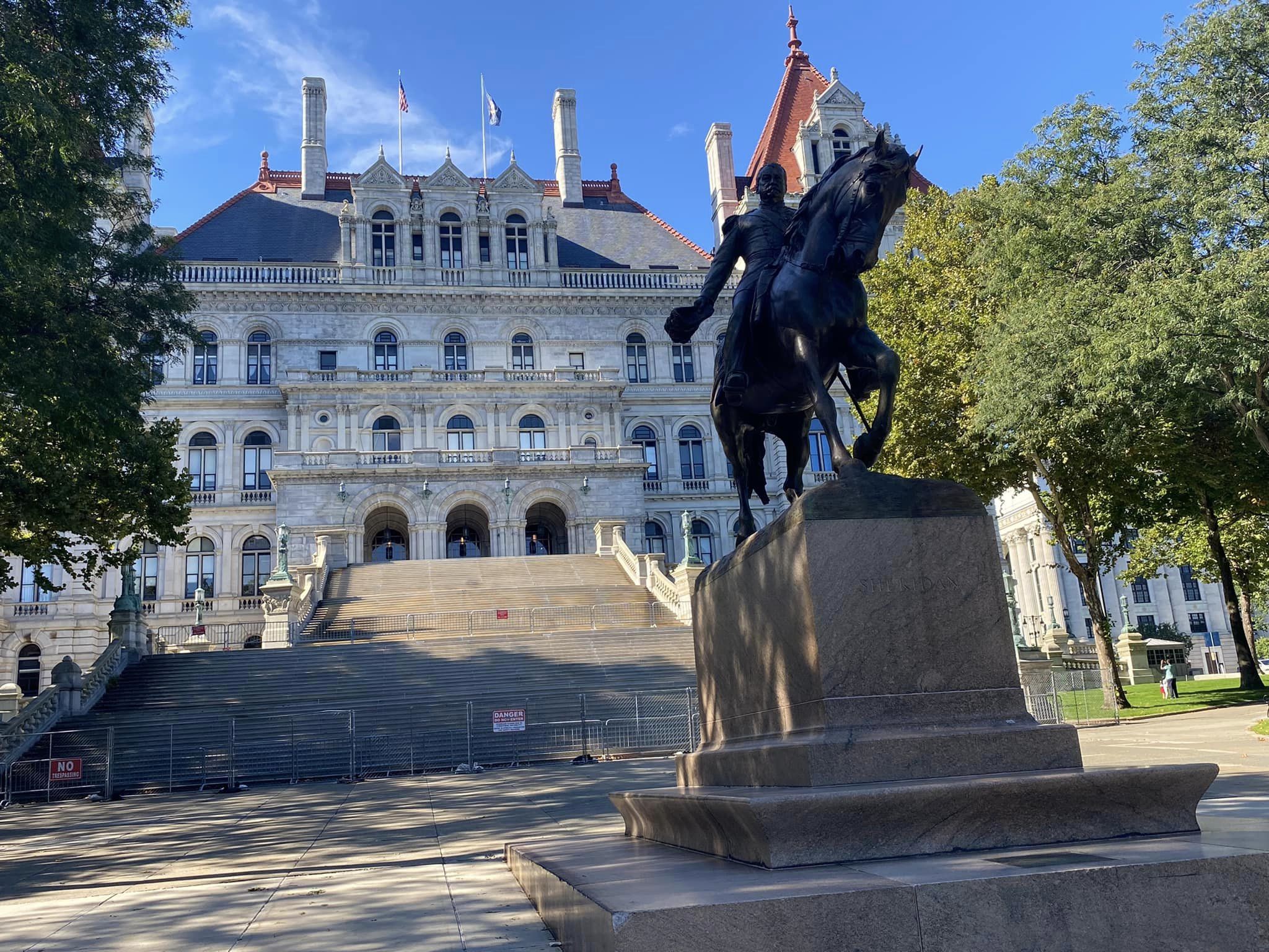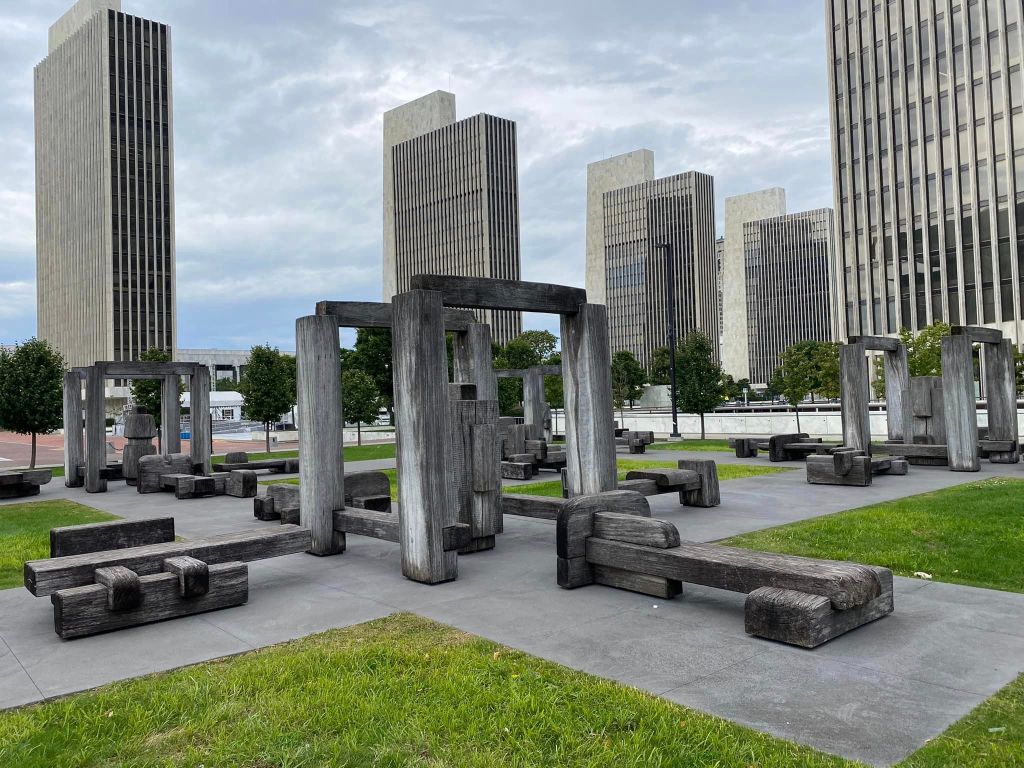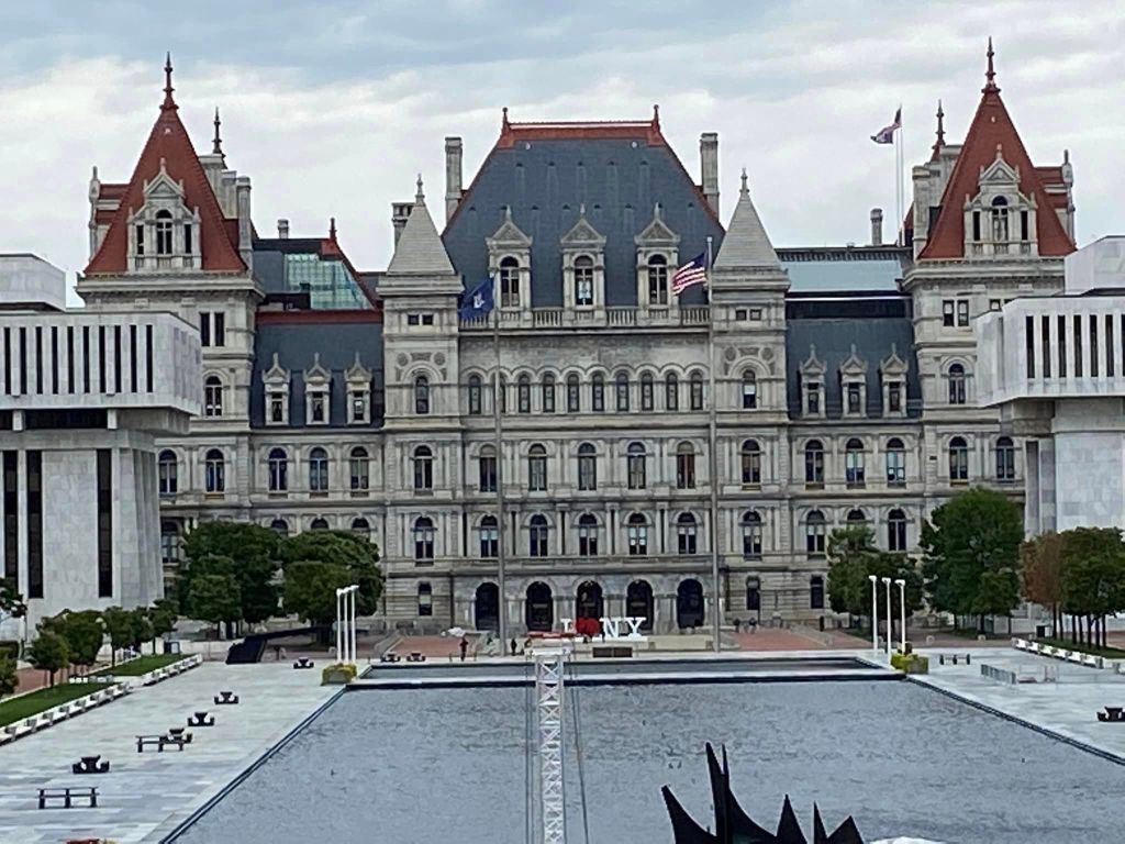 Empire State Plaza’s brutalist architecture rearing its forbidding forms.