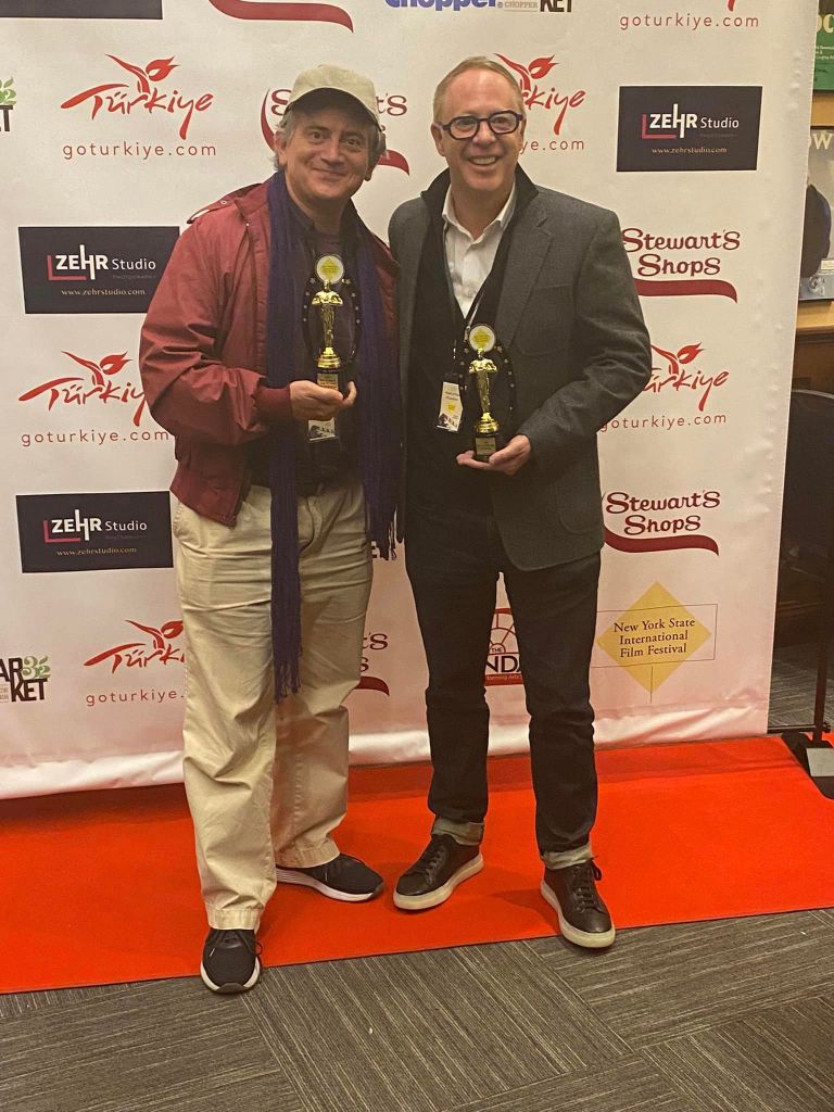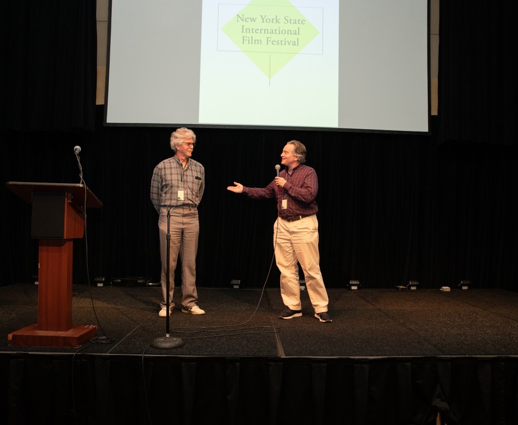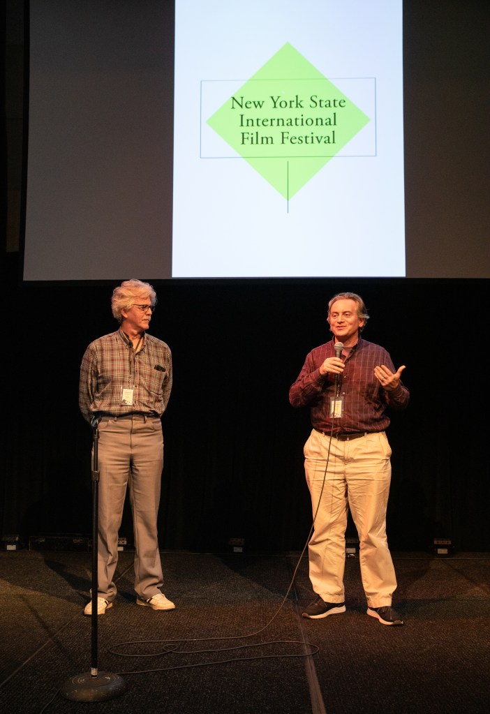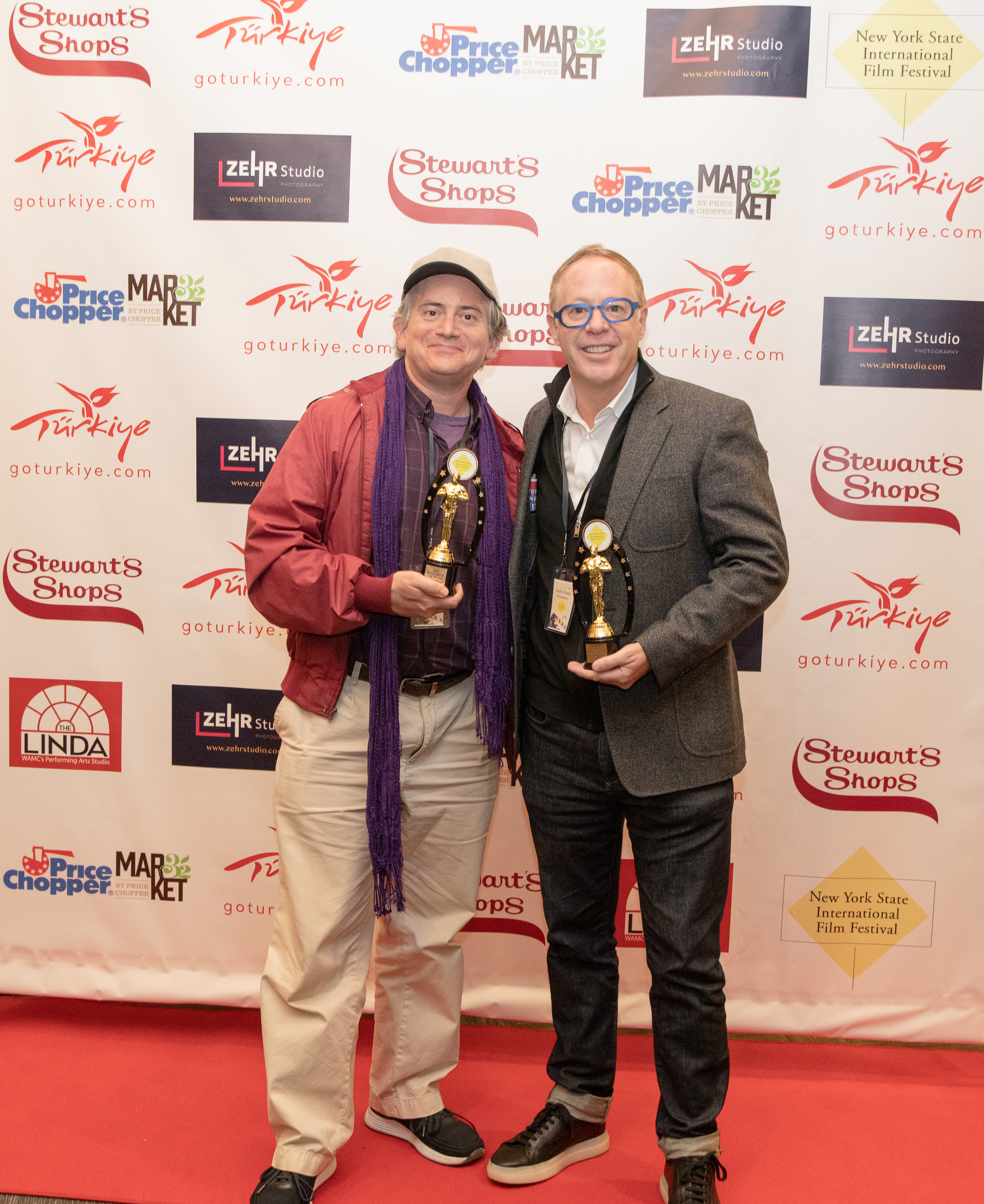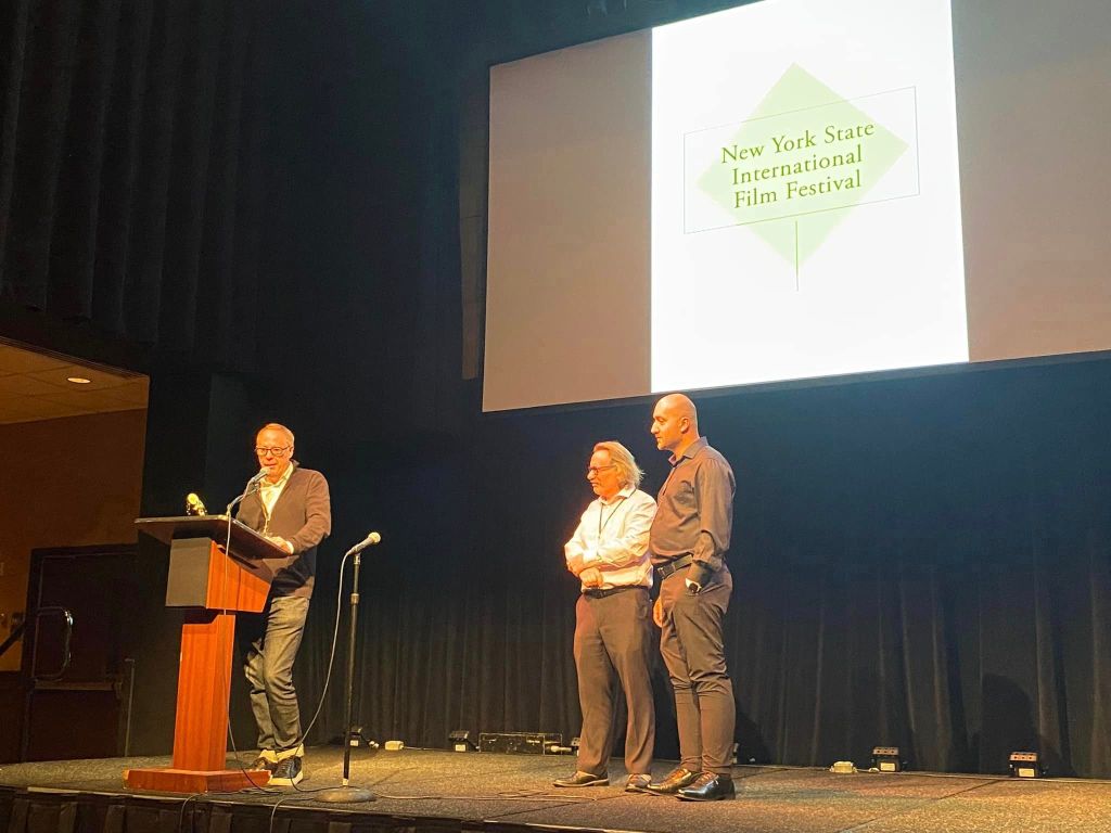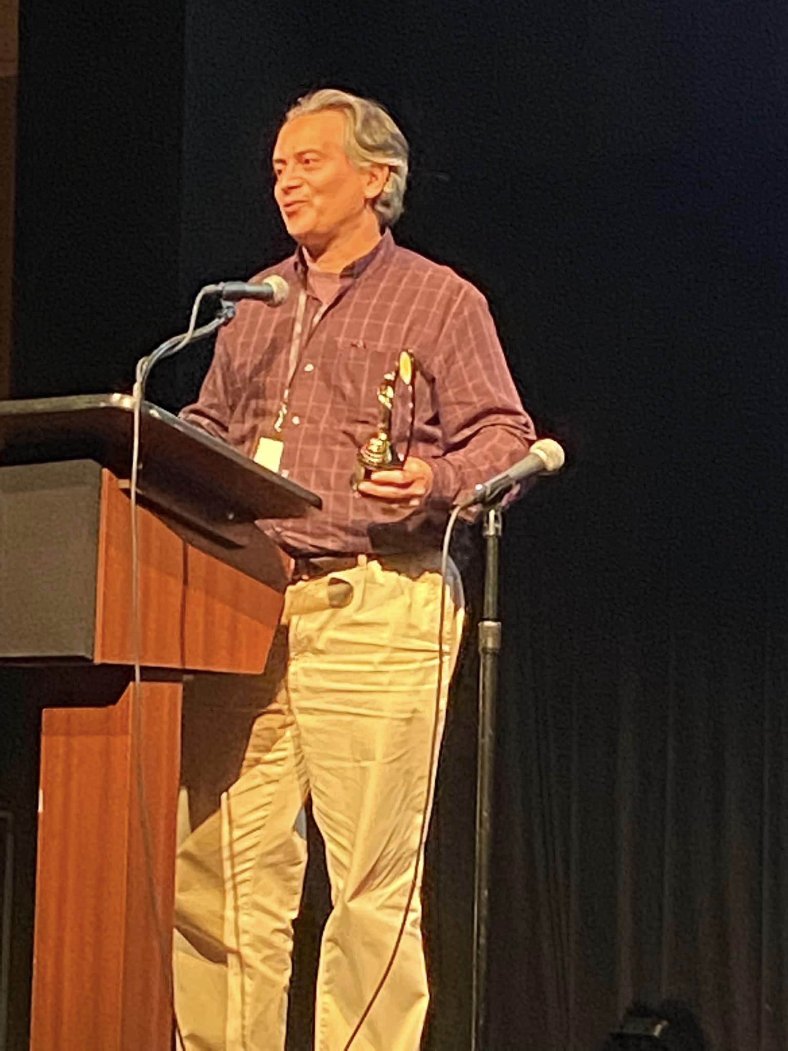 Three more awards were handed out that night (two others – for comedy and drama – had been handed out the previous night). Best Animated went to the very witty “Dragon Poets of Boston”, Best Music Video went to wonderfully deranged “Metube: August Sings ‘Una Furtiva Lagrima'”, and best Documentary went to the moving NYC pandemic panorama “Outside In”. Here director Mark O’Toole accepts his award while festival organizers Nico Altekin and Carl Kinlin look on.