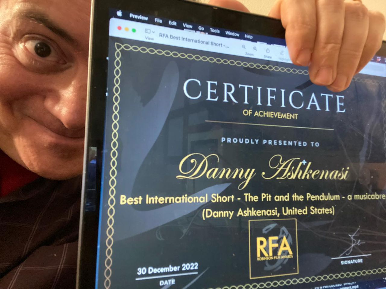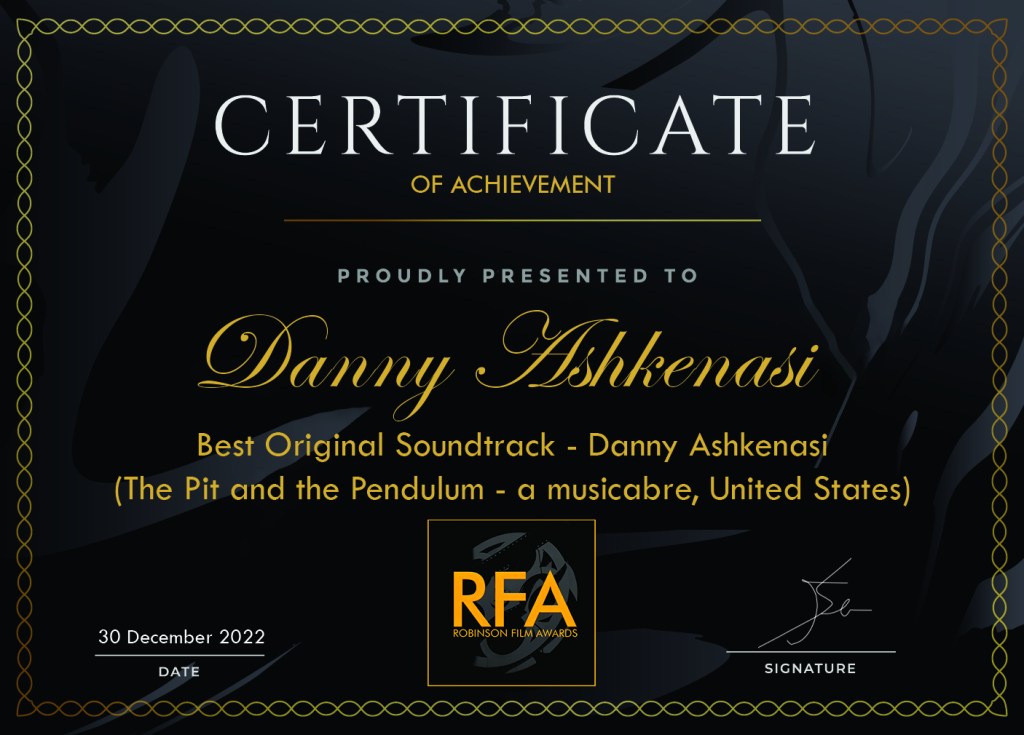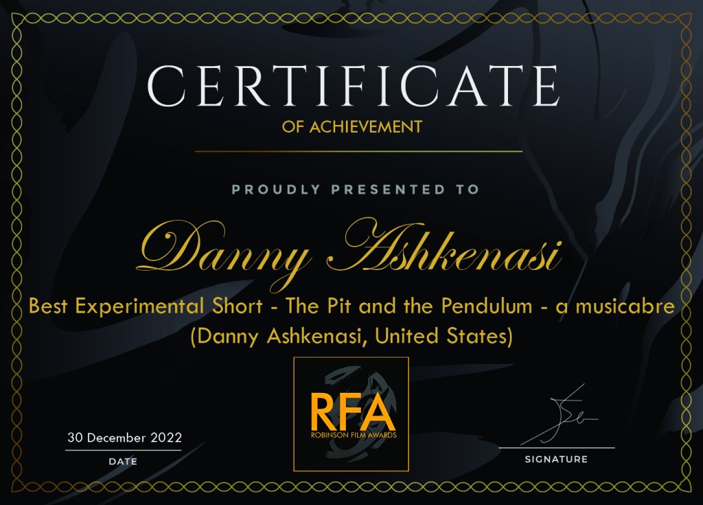 The Robinson Film Awards International Film Festival, located in Naples, Italy, has announced their bimonthly awards for December, 2022, and distinguished “The Pit and the Pendulum – a musicabre” with three awards – the only film to receive as many – including Best International Short.