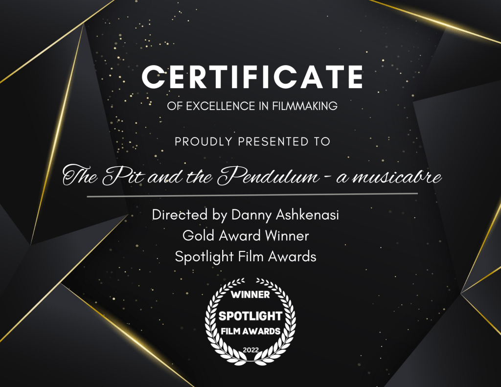 Spotlight Film Awards just announced the winners of its 2022 awards. My musical short film Edgar Allan Poe adaptation, “The Pit and the Pendulum – a musicabre” was awarded one of its highest honors, a Spotlight Gold Award.