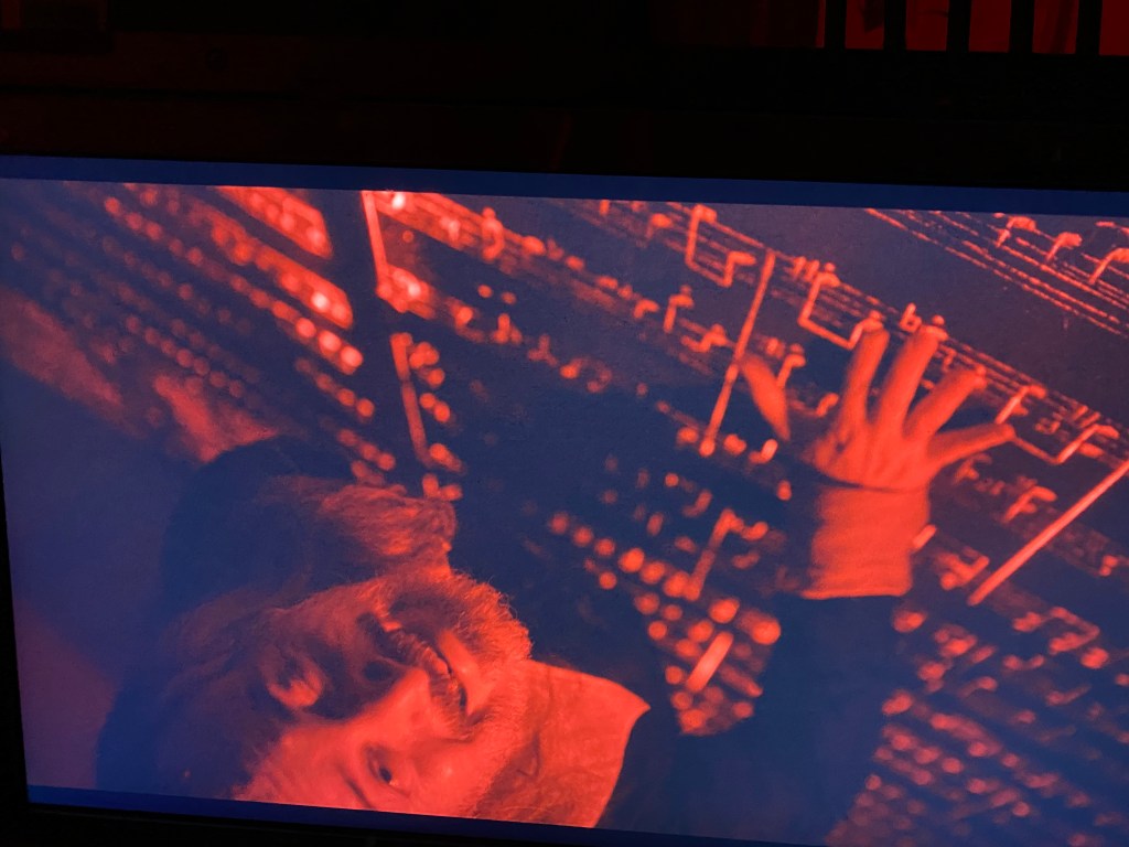 The shot above is a look into the on-set monitor, a dramatic glimpse into the filming of “The Walls” segment of “The Pit and the Pendulum – a musicabre”, where the protagonist of Edgar Allan Poe’s short story about the death traps of the Spanish Inquisition finds the walls of his prison cell glowing a searingly hot red and then closing in on him.
