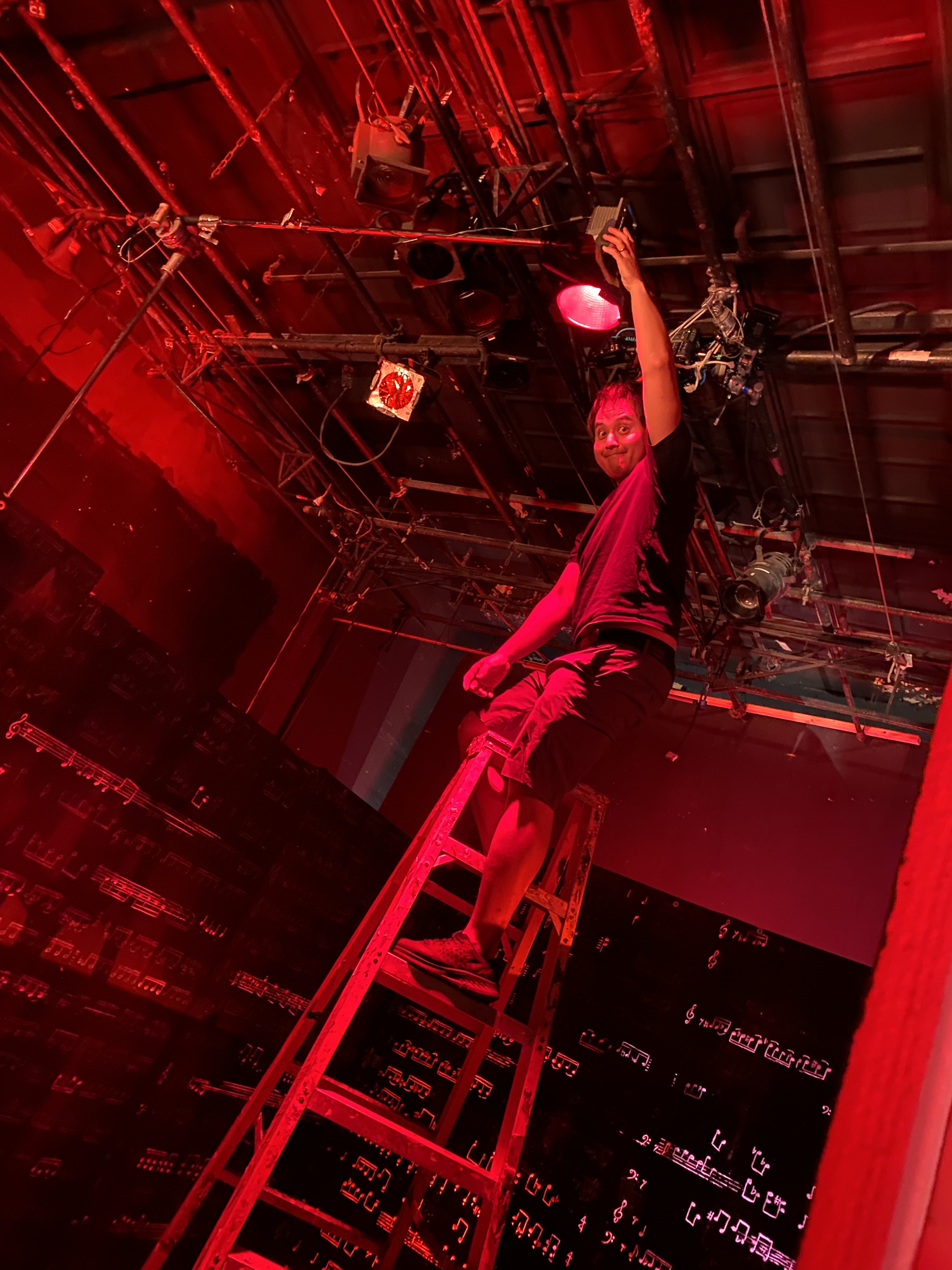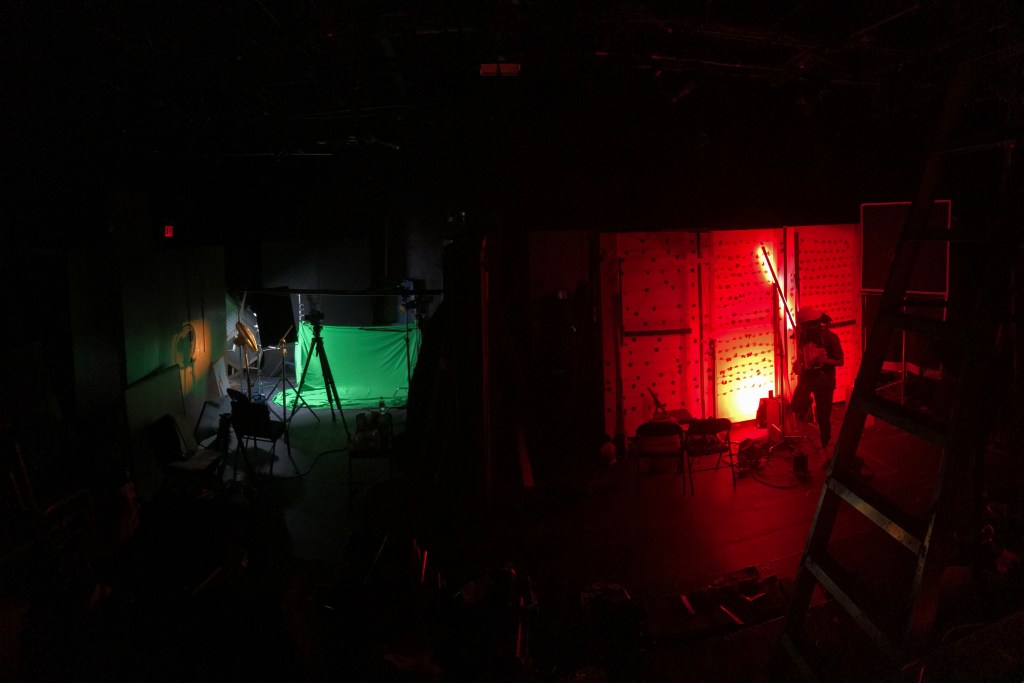 Ja’rel Ivory, assisted by Keisuke Koijima, attaching the camera to the overhead grid. For the overhead shots of the protagonists trapped in the cell. Once the camera was turned on it stayed on until someone climbed the ladder again. Which means we ended up with one two hour long uninterrupted take of me alone in the cell being put through my horrific paces.