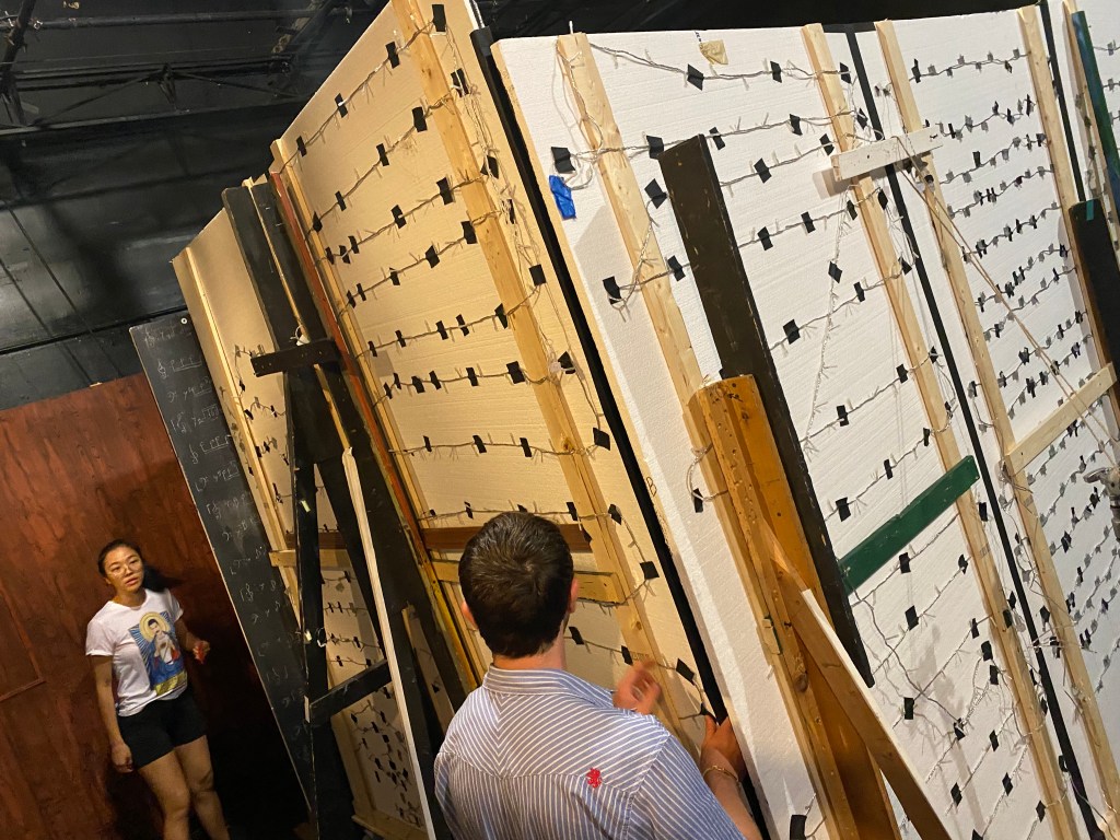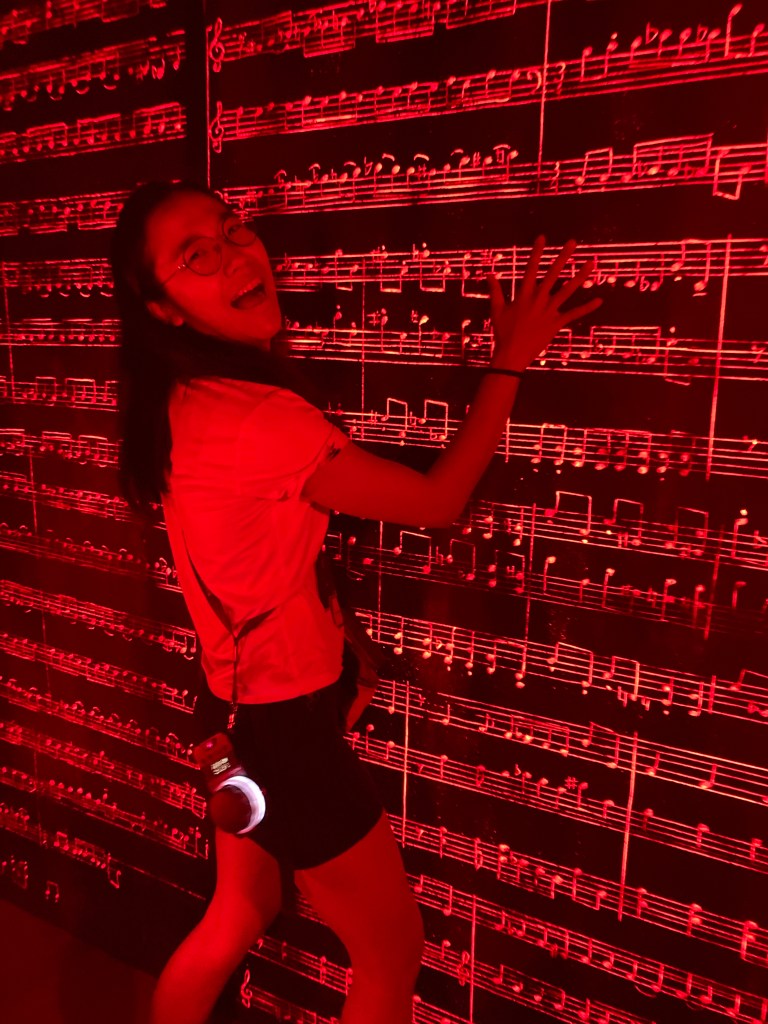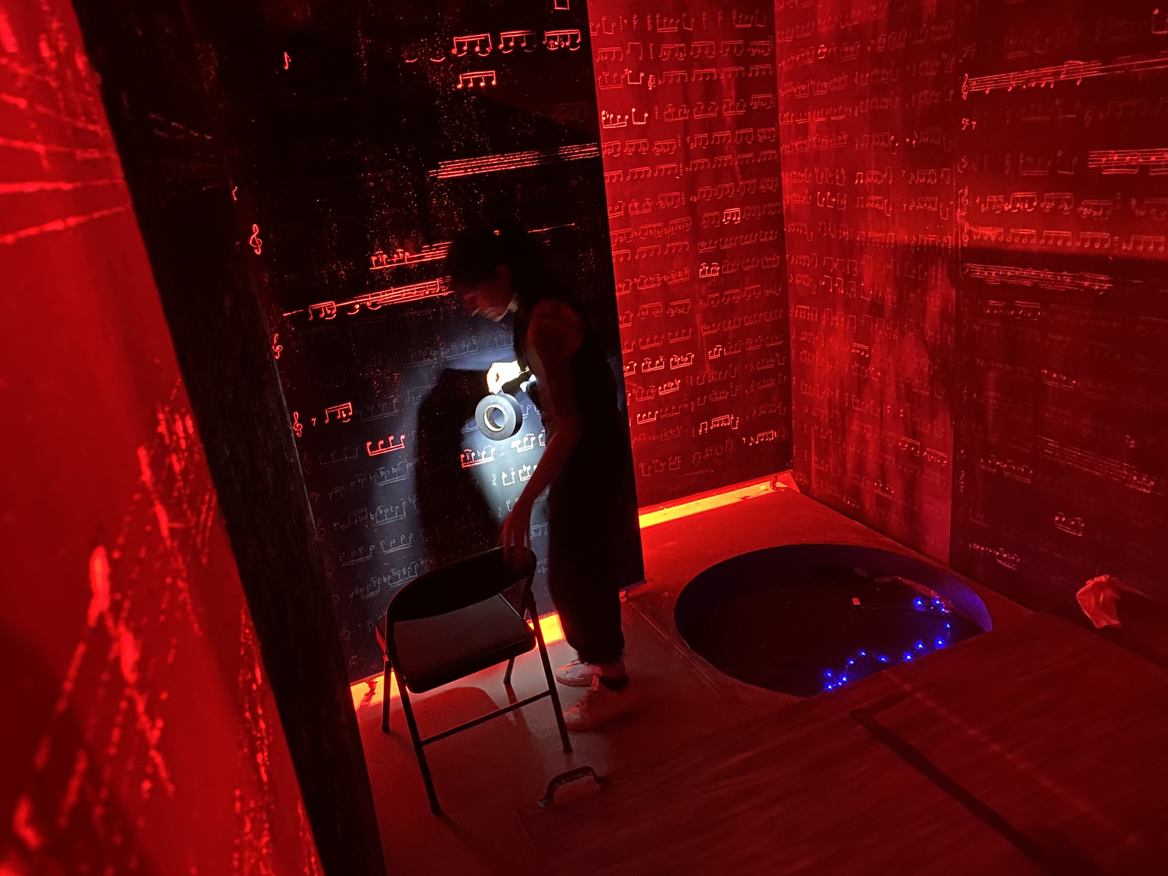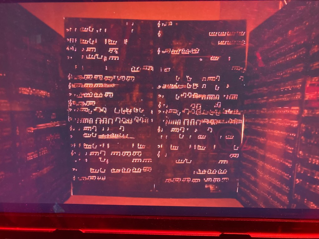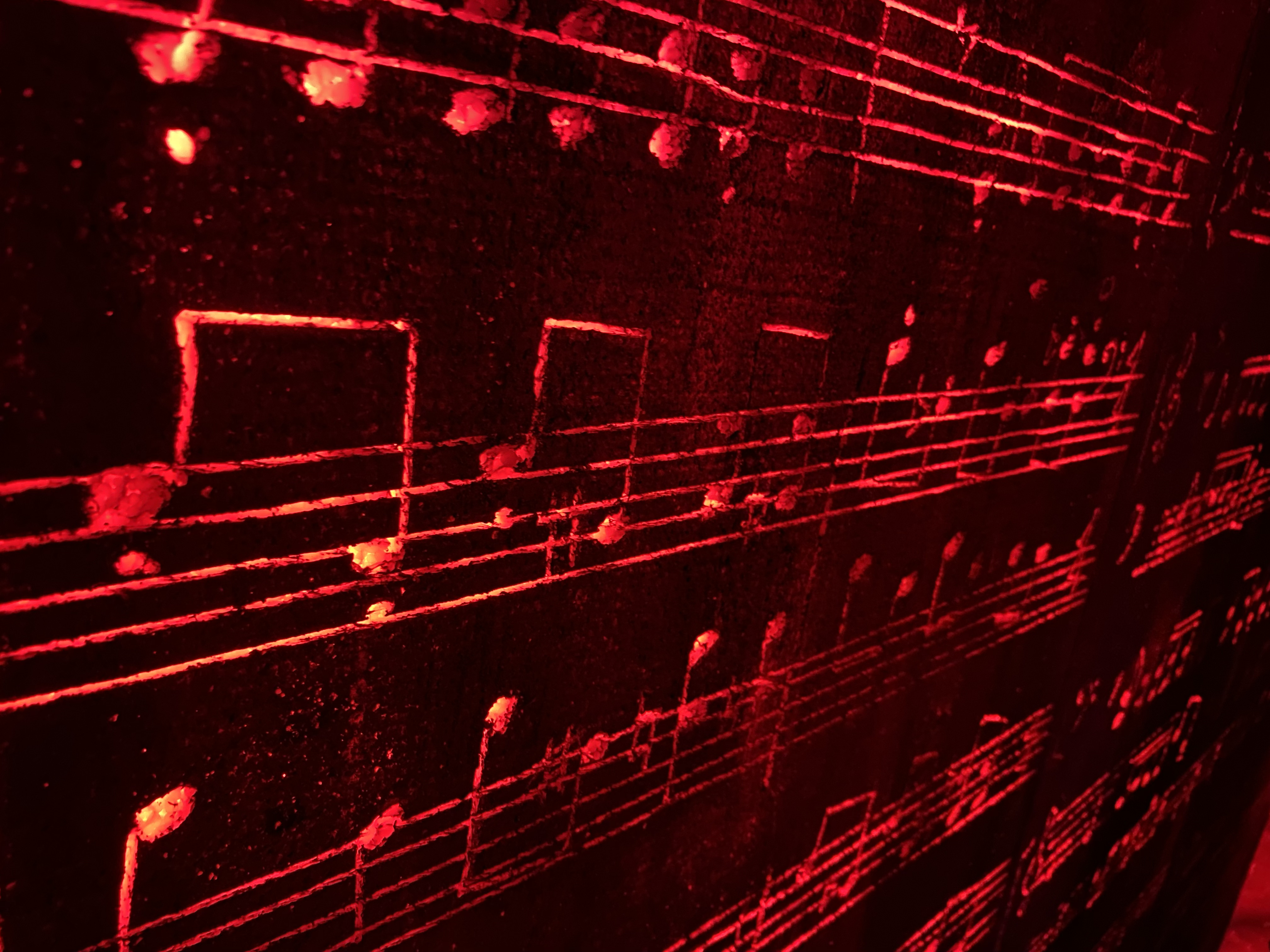 An endless string of red lights were taped to the back of the cell walls to make the notes gleam red within.