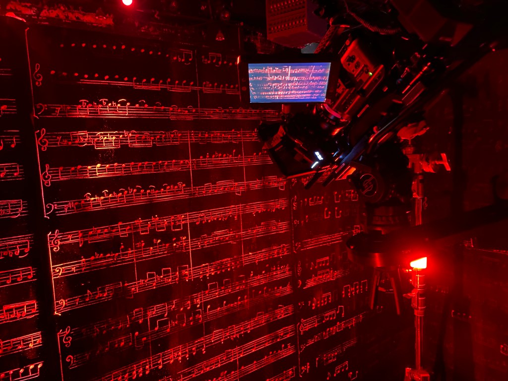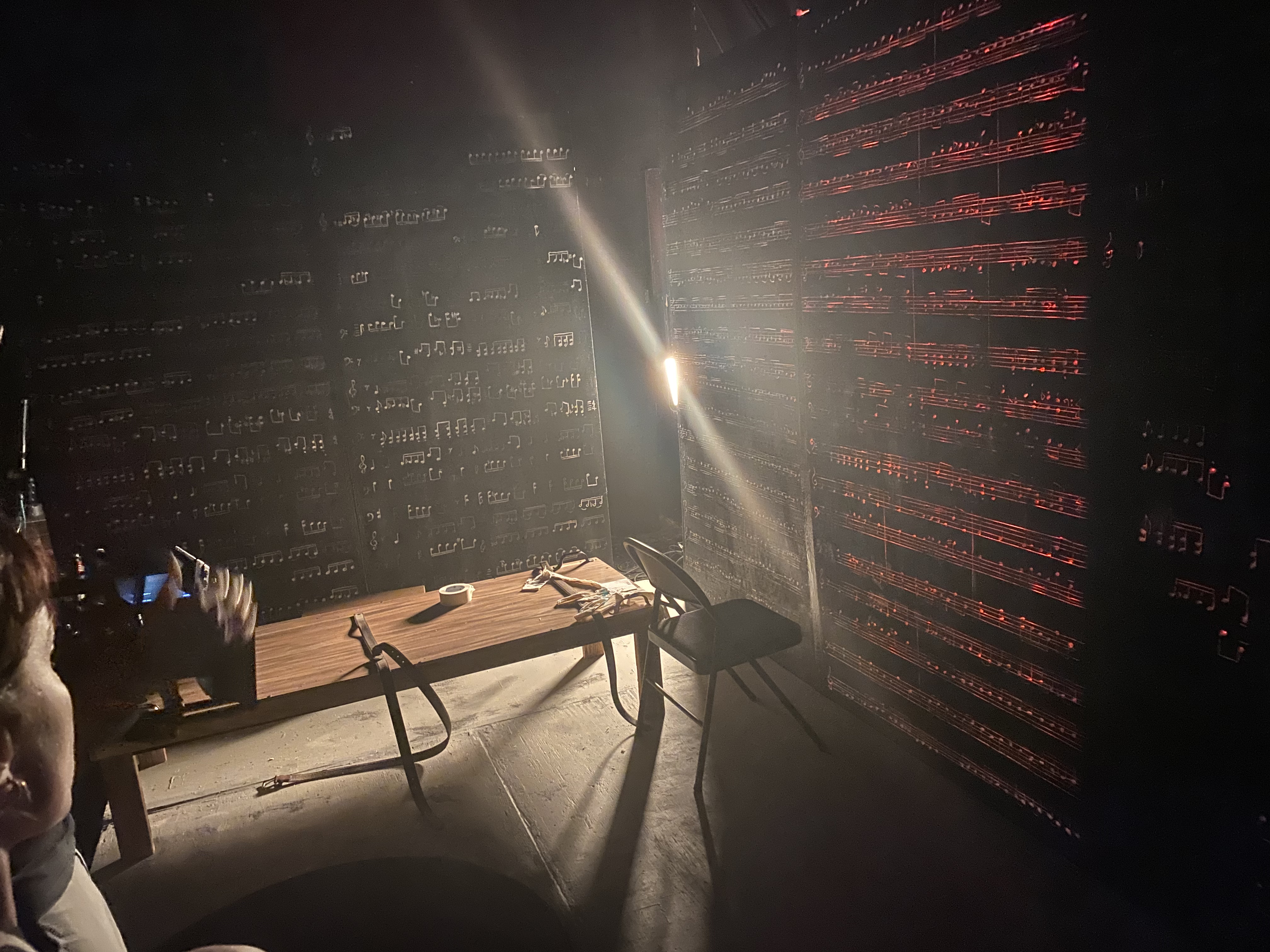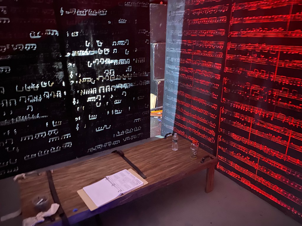 Below, one of the cell walls. Musical notes are etched into them, lit from behind with red lights.