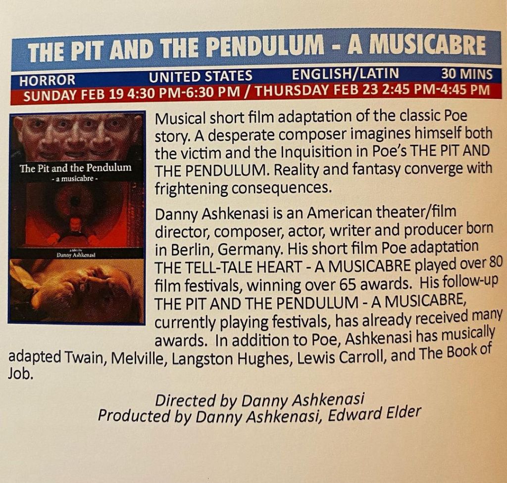 “The Pit and the Pendulum – a musicabre“, my short film musical adaptation of the classic Edgar Allan Poe short story, will screen twice at the Winter Film Awards International Film Festival: Sunday, Feb 19 at 4:30pm (followed by a Q&A) and Thursday, Feb 23 at 2:45pm.
