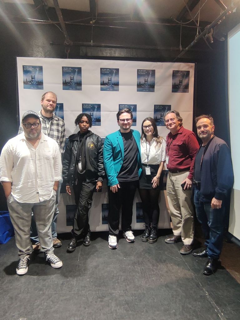 From Left: Colin Francis Costello, director of STORAGE, Joe Leuben, director of FINGER, Kimberly David, director of CREEPERS, Arik Bariedl director of DILEMMA, and Lead Actor Elli Deja Bauriedl, Danny Ashkenasi director of THE PIT AND THE PENDULUM- A MUSICABRE, Dan Abella, director of The New York Sci-Fi Film Festival