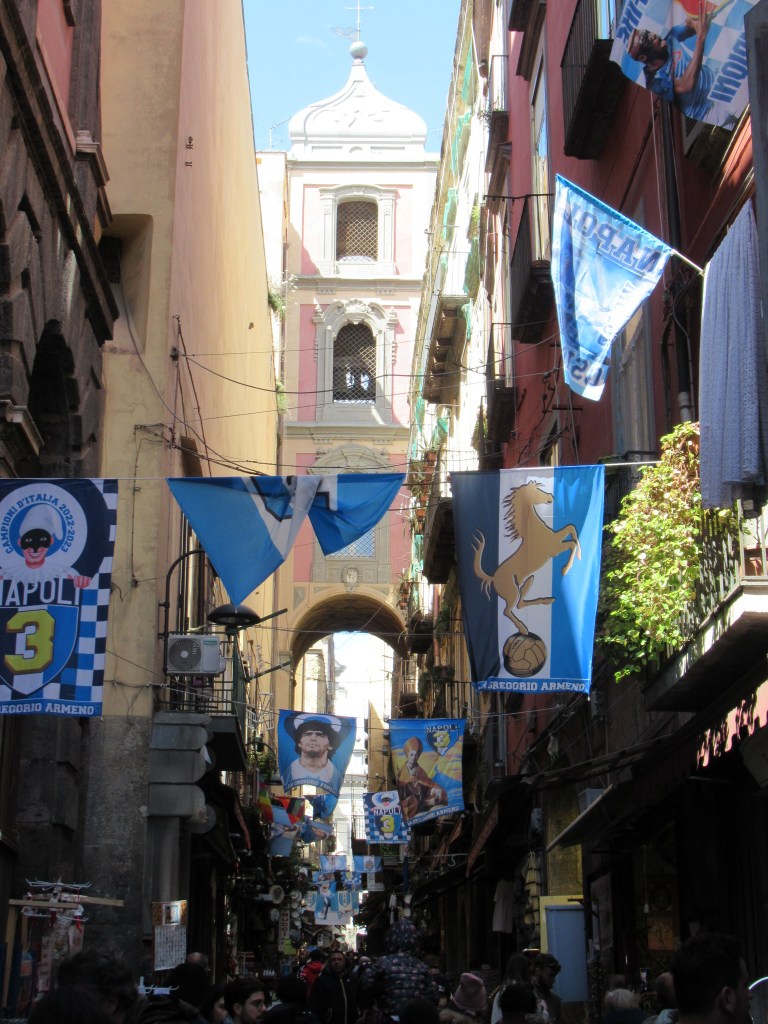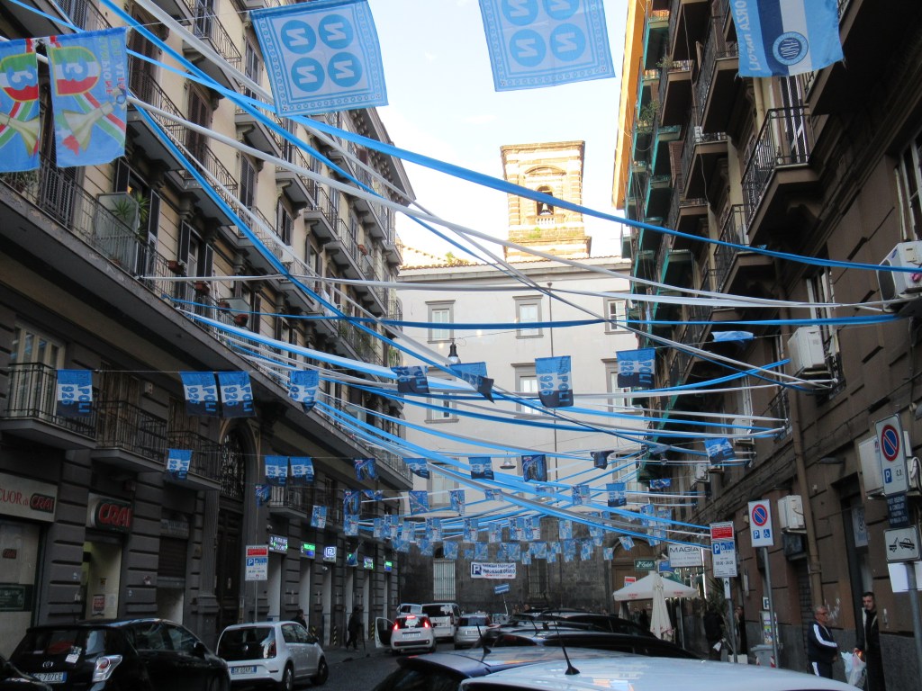 On our first stroll out in Napoli, we noticed blue and white banners everywhere. Since it was the day before Easter, we initially assumed the decorations were in honor of that High Holy Day…