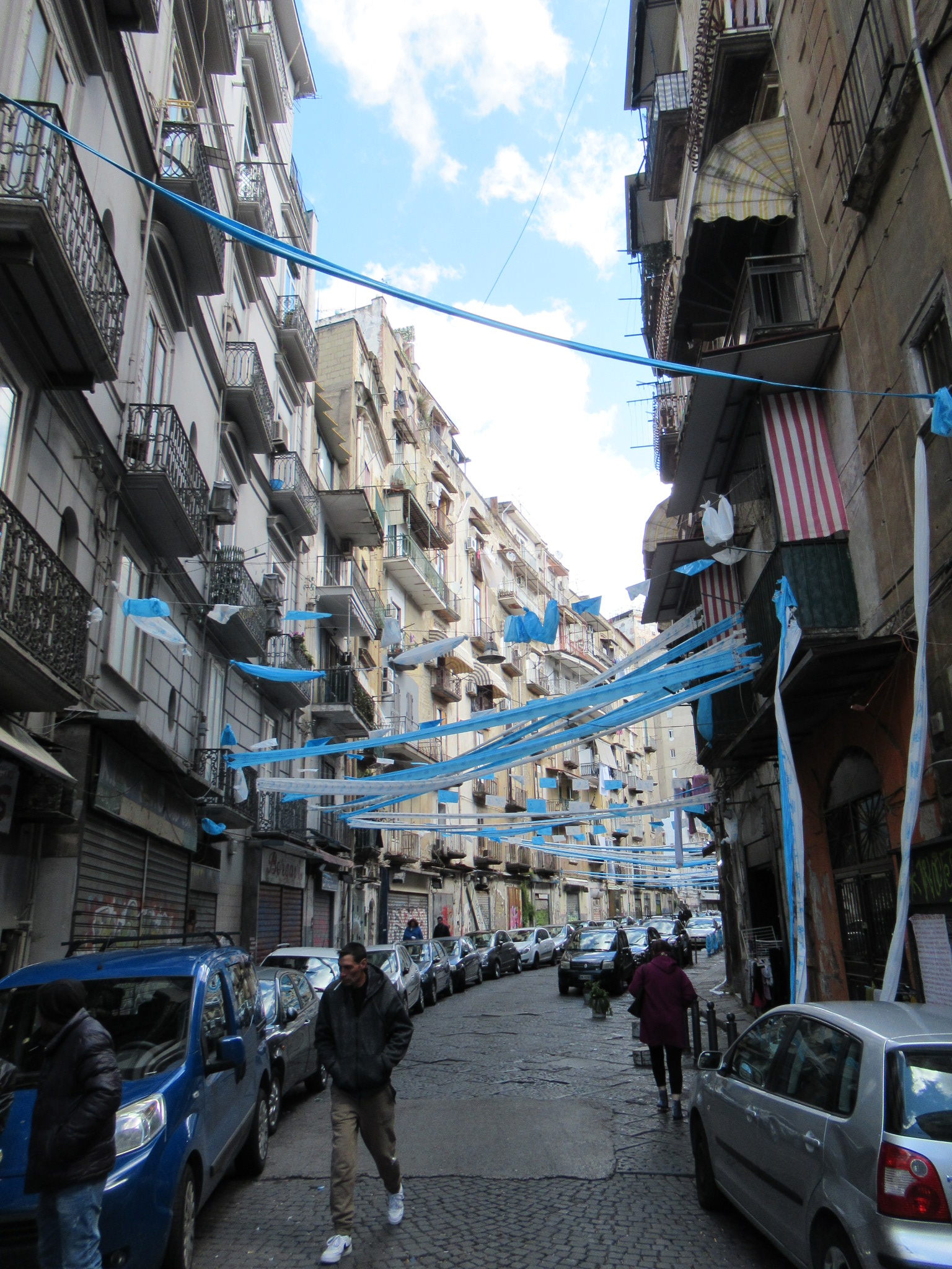 On our first stroll out in Napoli, we noticed blue and white banners everywhere. Since it was the day before Easter, we initially assumed the decorations were in honor of that High Holy Day…