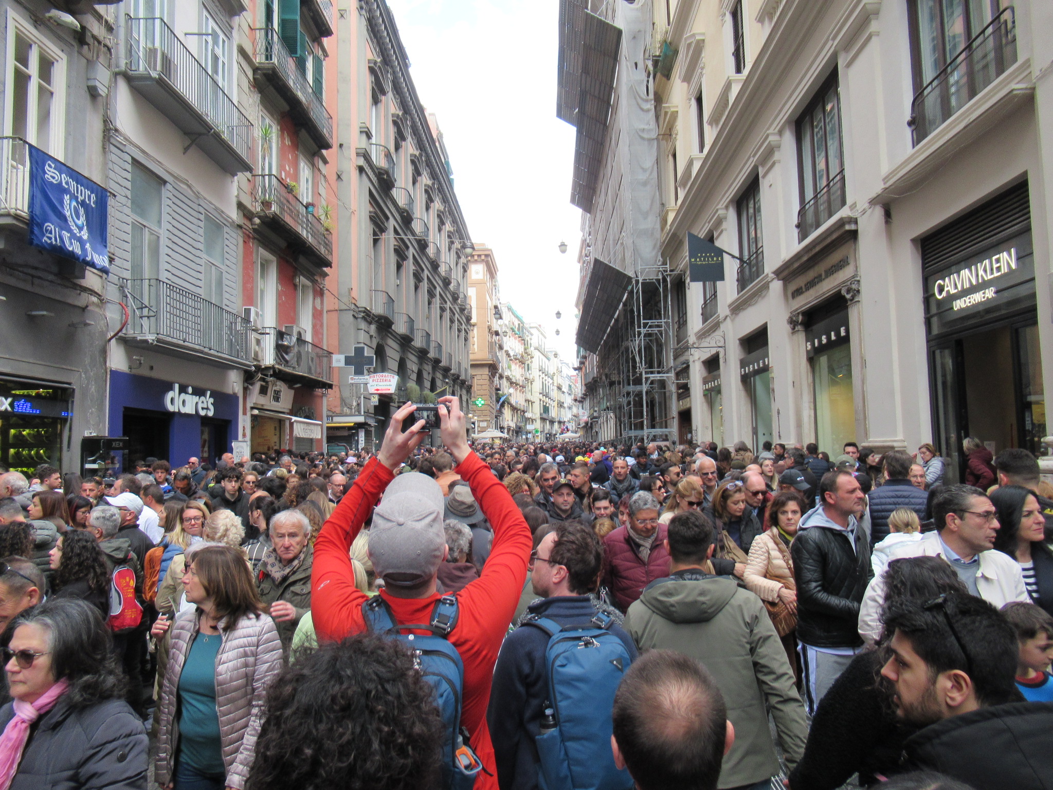 This is what Easter Sunday looked like on Via Toledo, a major road in Naples, absolutely packed with Neapolitans taking their Easter Sunday stroll.
