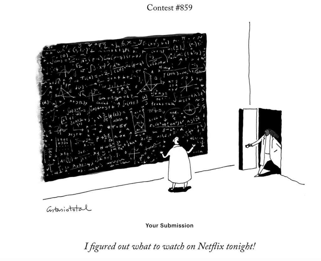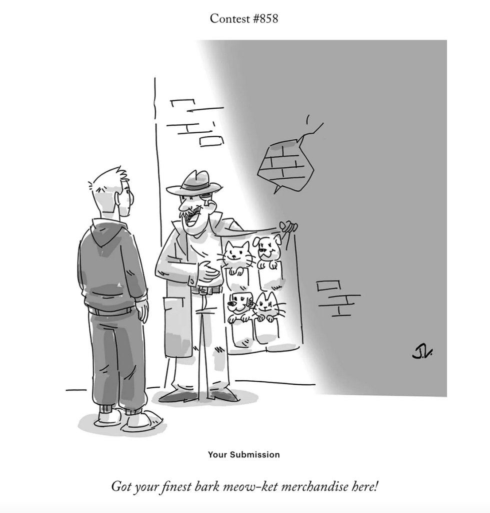 And we’re back! The New Yorker chose not to include any of my first six suggestions as a finalist in their “make up your own cartoon caption” contest.